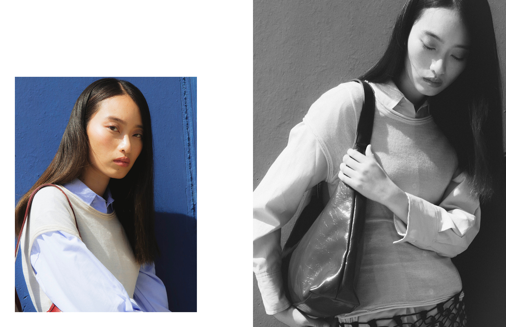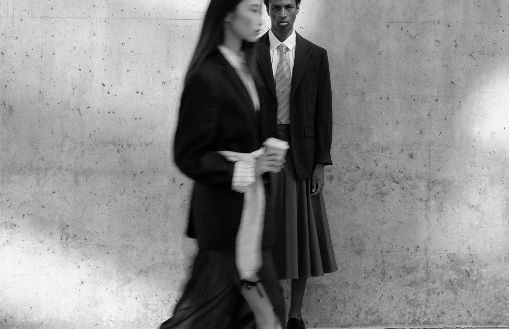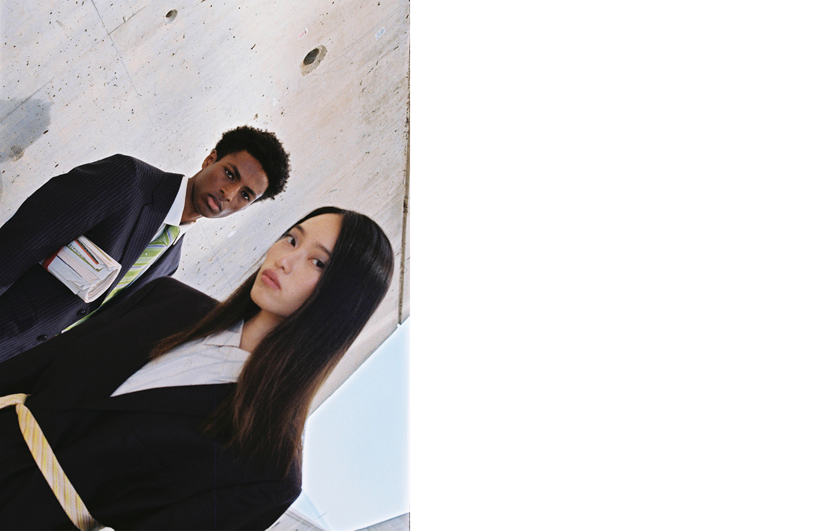 Models Eyasu Gonzalez and Song Z stun in Yves Saint Laurent, Emporio Armani, and Sandro Paris in this business chic Schön! online editorial photographed by Ángela Ibáñez Pérez with fashion by Carlos Baños and make up by Gisela Maqueda