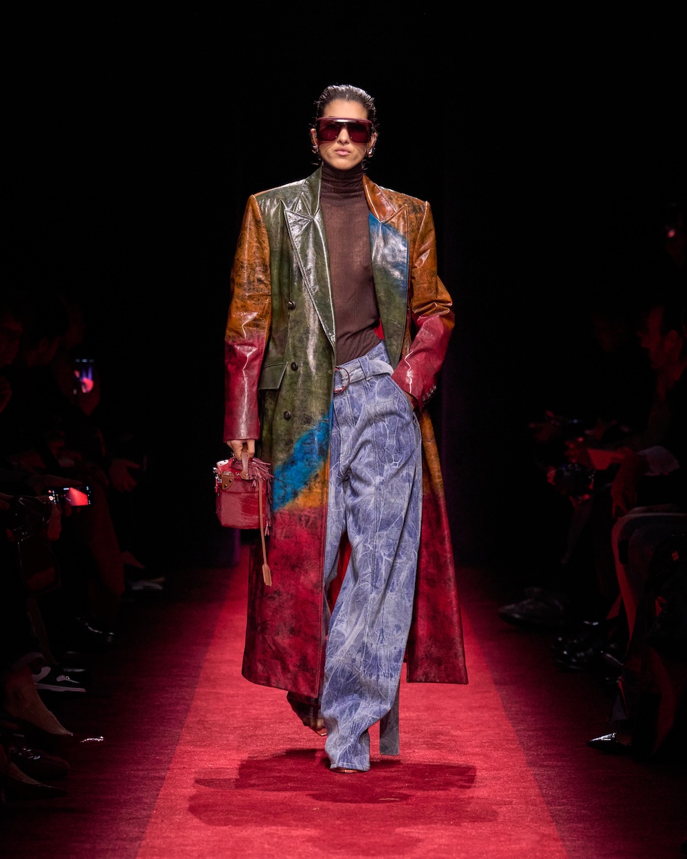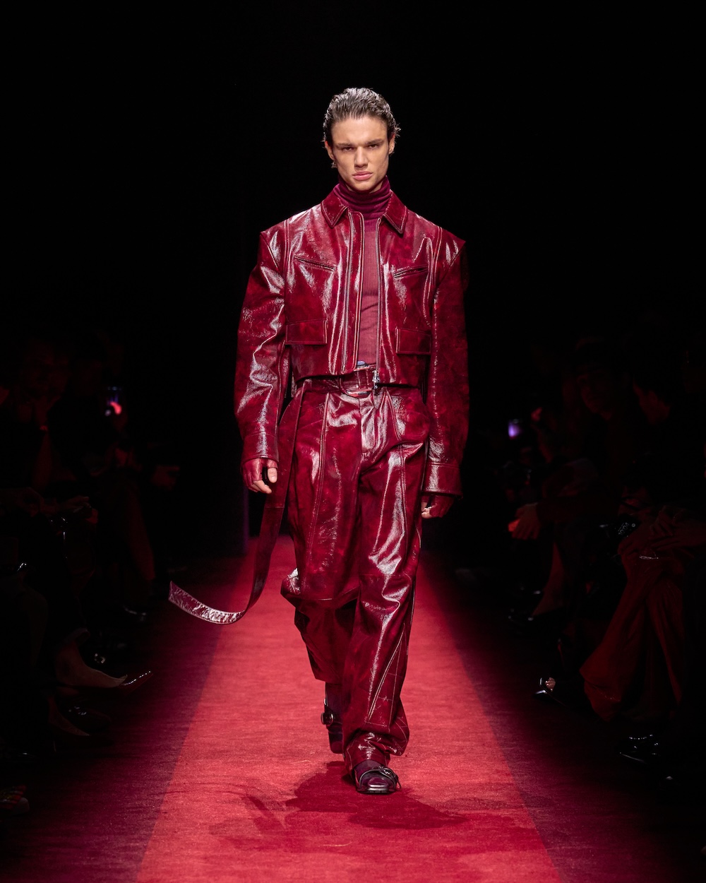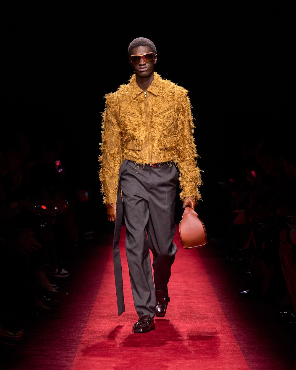 Textures lead the conversation. Leather is oiled, sponged, and brushed to mimic the patina of a well-worn masterpiece. Denim, reimagined in trompe-l’œil variations, becomes a play on perception, while cashmere undergoes surface-sabling for an ultra-soft finish. Even knitwear gets a sculptural treatment — braided, ribbed, and polished to a shine. Across the collection, materials are pushed to their limits, manipulated like the bodywork of a Ferrari itself.