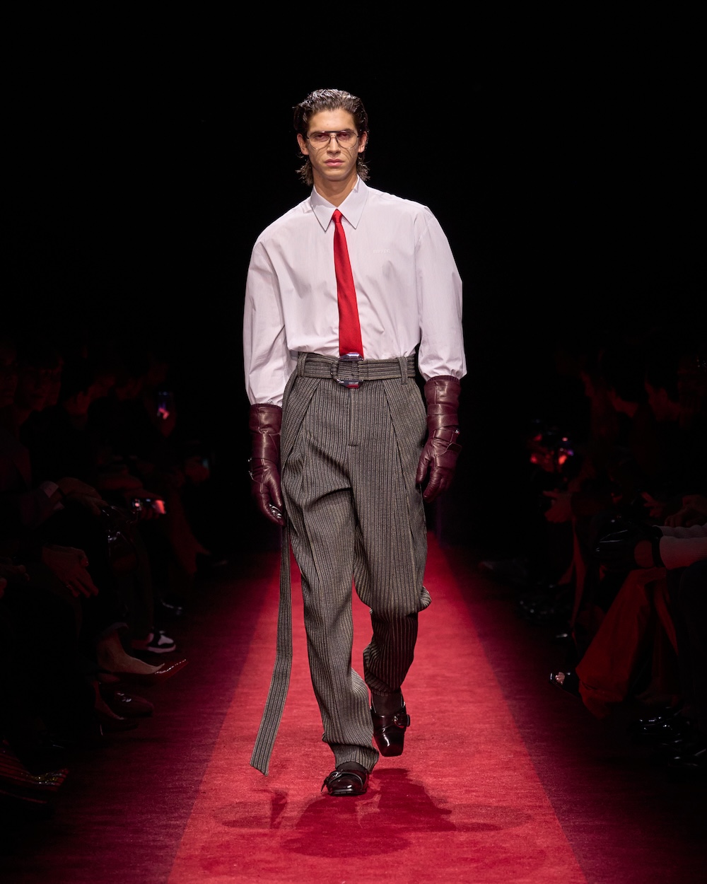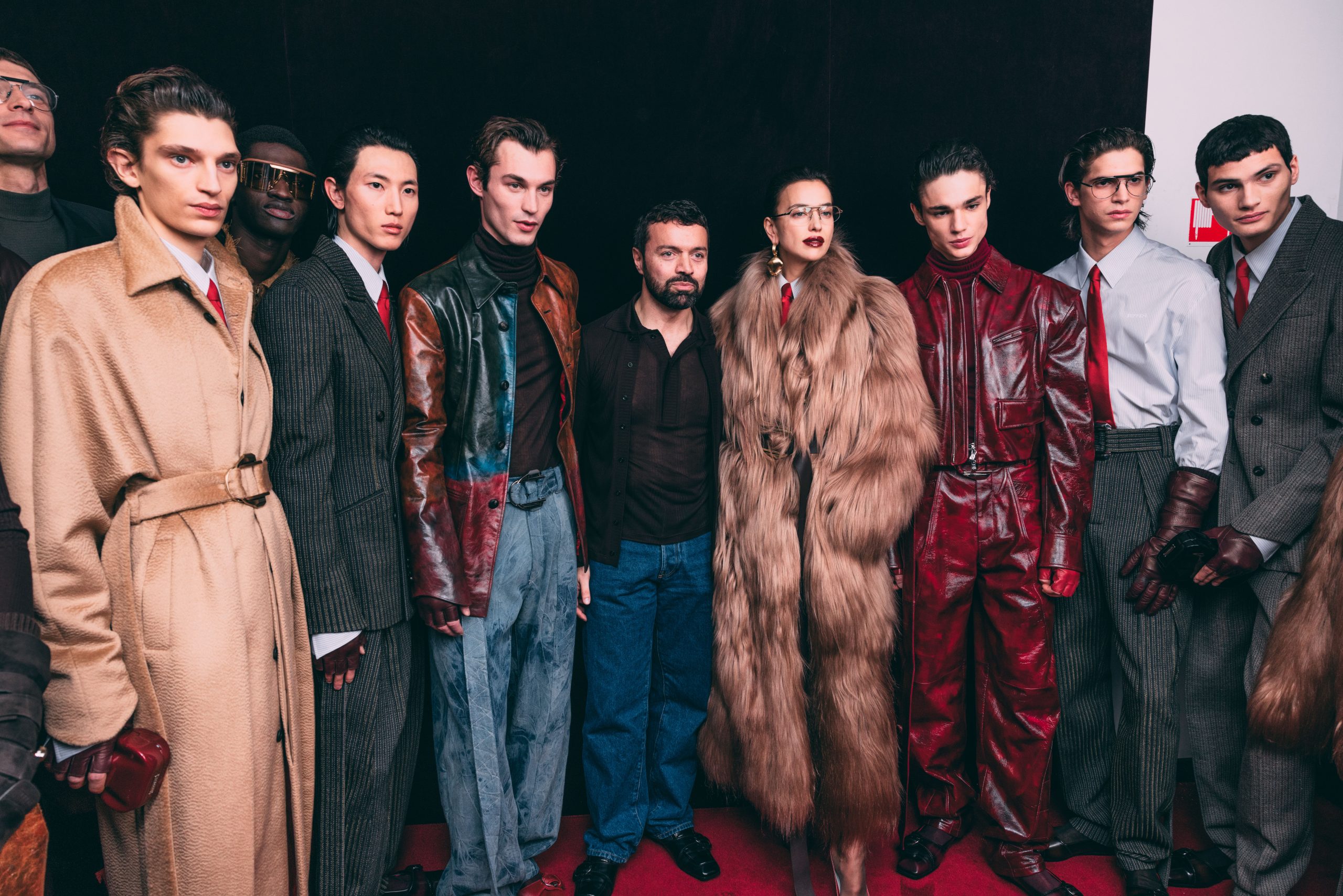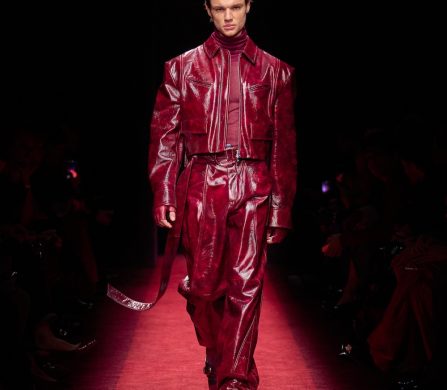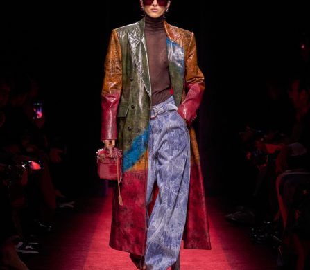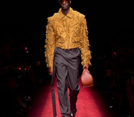 Textures lead the conversation. Leather is oiled, sponged, and brushed to mimic the patina of a well-worn masterpiece. Denim, reimagined in trompe-l’œil variations, becomes a play on perception, while cashmere undergoes surface-sabling for an ultra-soft finish. Even knitwear gets a sculptural treatment — braided, ribbed, and polished to a shine. Across the collection, materials are pushed to their limits, manipulated like the bodywork of a Ferrari itself.