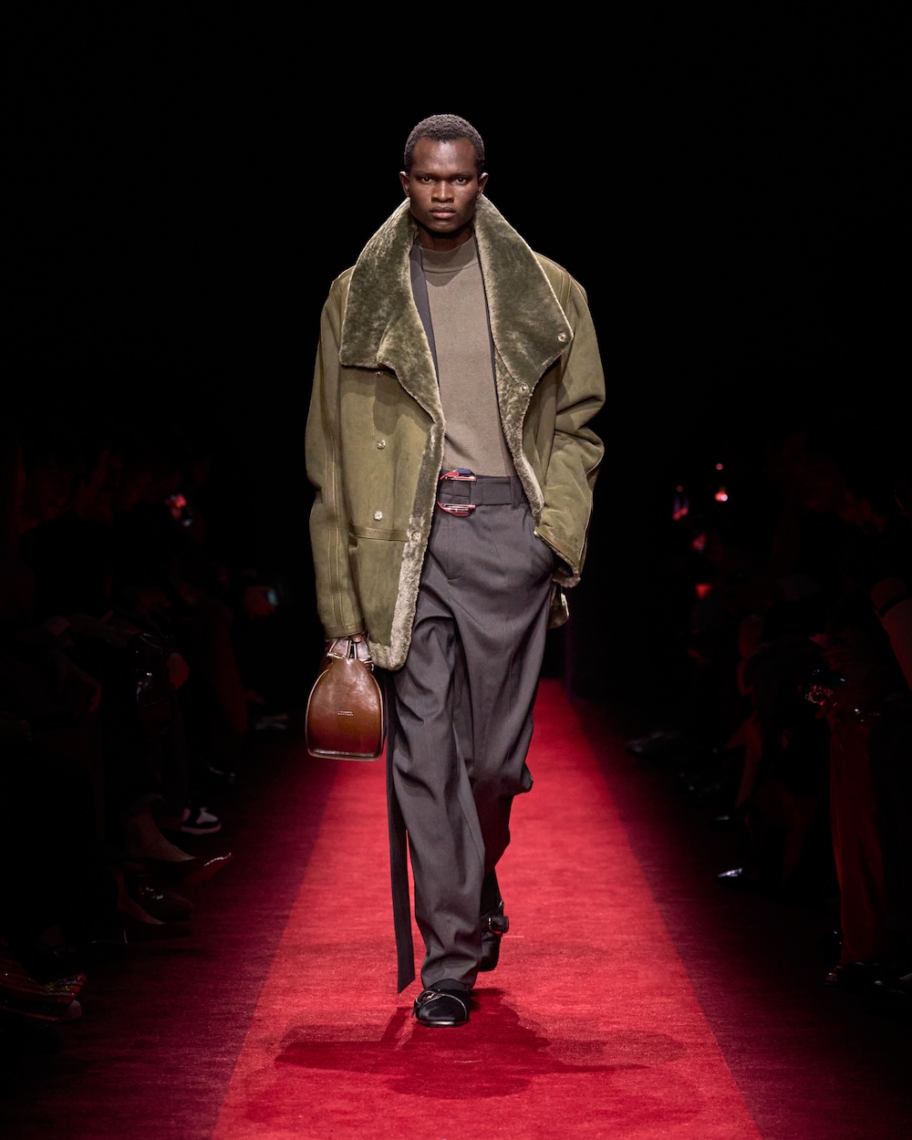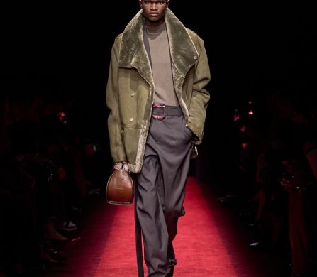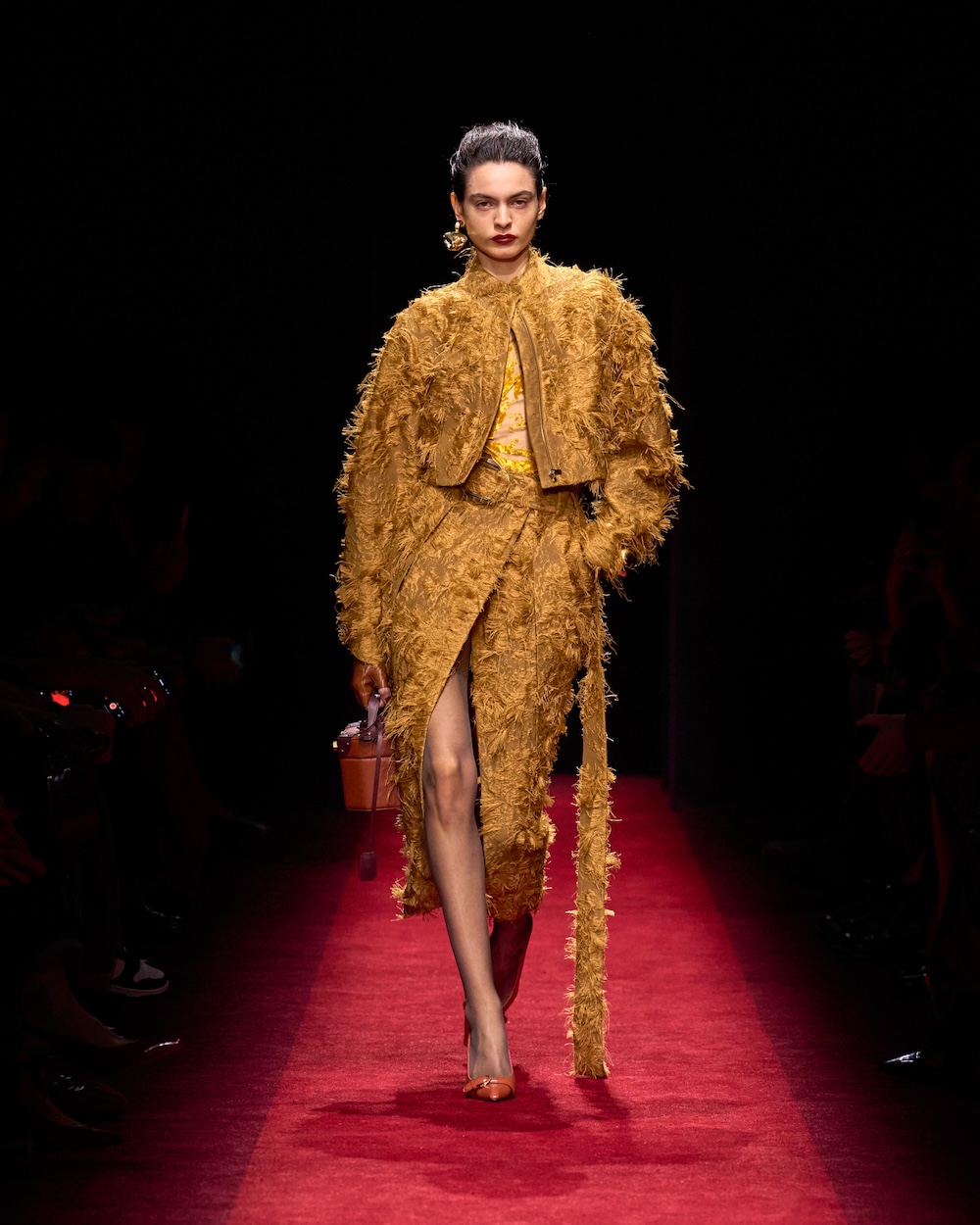 Silhouettes follow suit, shaped and reshaped until they achieve the right balance of precision and movement. Jackets are elongated, shoulders amplified, waists defined. Pinstripes emerge in 3D weaves, velour jerseys drape like velvet, and garment-dyed nylon gabardine takes on an iridescence that shifts under the light. Shearling — a common trend of the season — is treated to reveal frosted textures and radiant finishes, while silk velvets are heightened with jacquard fil coupé and subtle devoré prints.
