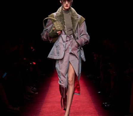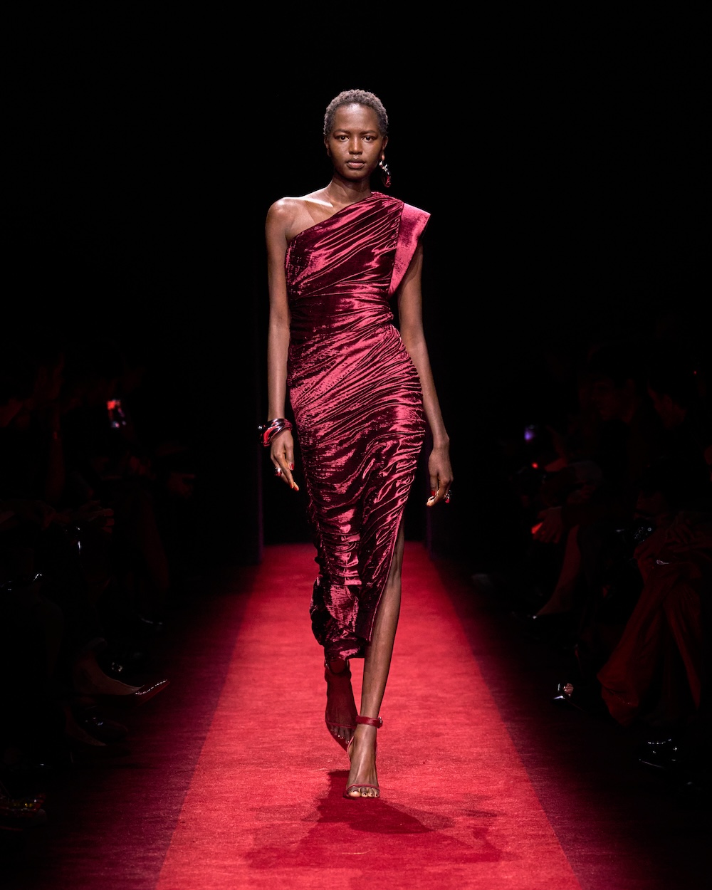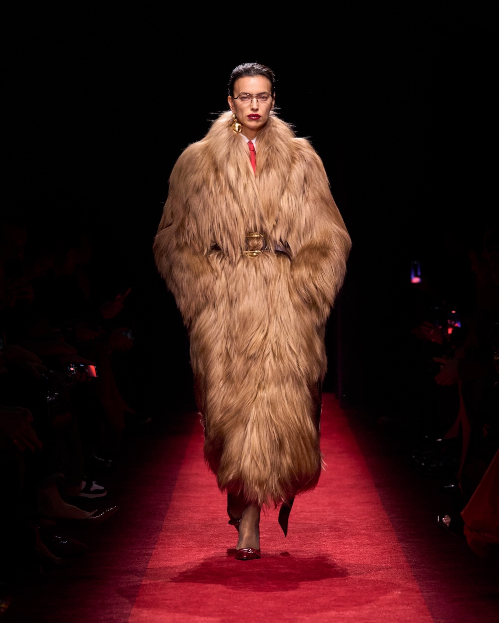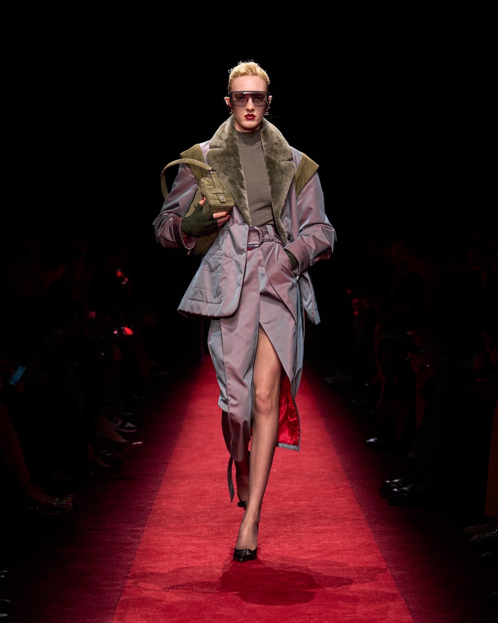 Silhouettes follow suit, shaped and reshaped until they achieve the right balance of precision and movement. Jackets are elongated, shoulders amplified, waists defined. Pinstripes emerge in 3D weaves, velour jerseys drape like velvet, and garment-dyed nylon gabardine takes on an iridescence that shifts under the light. Shearling — a common trend of the season — is treated to reveal frosted textures and radiant finishes, while silk velvets are heightened with jacquard fil coupé and subtle devoré prints.