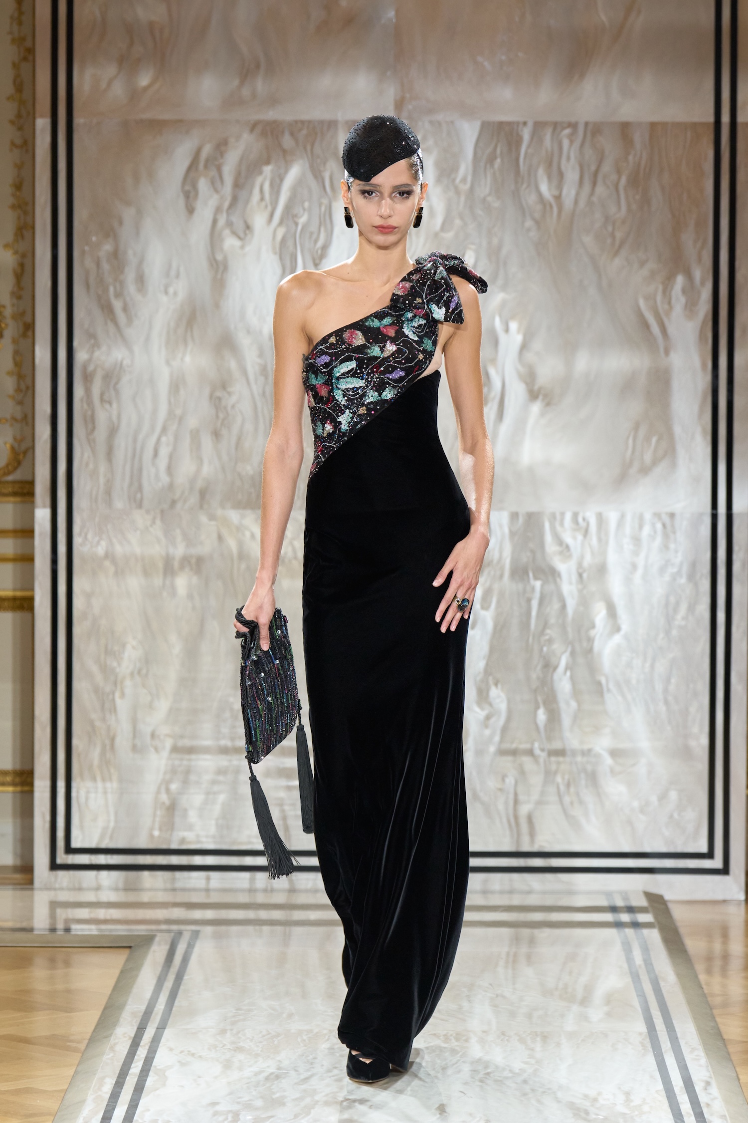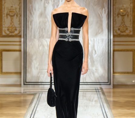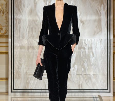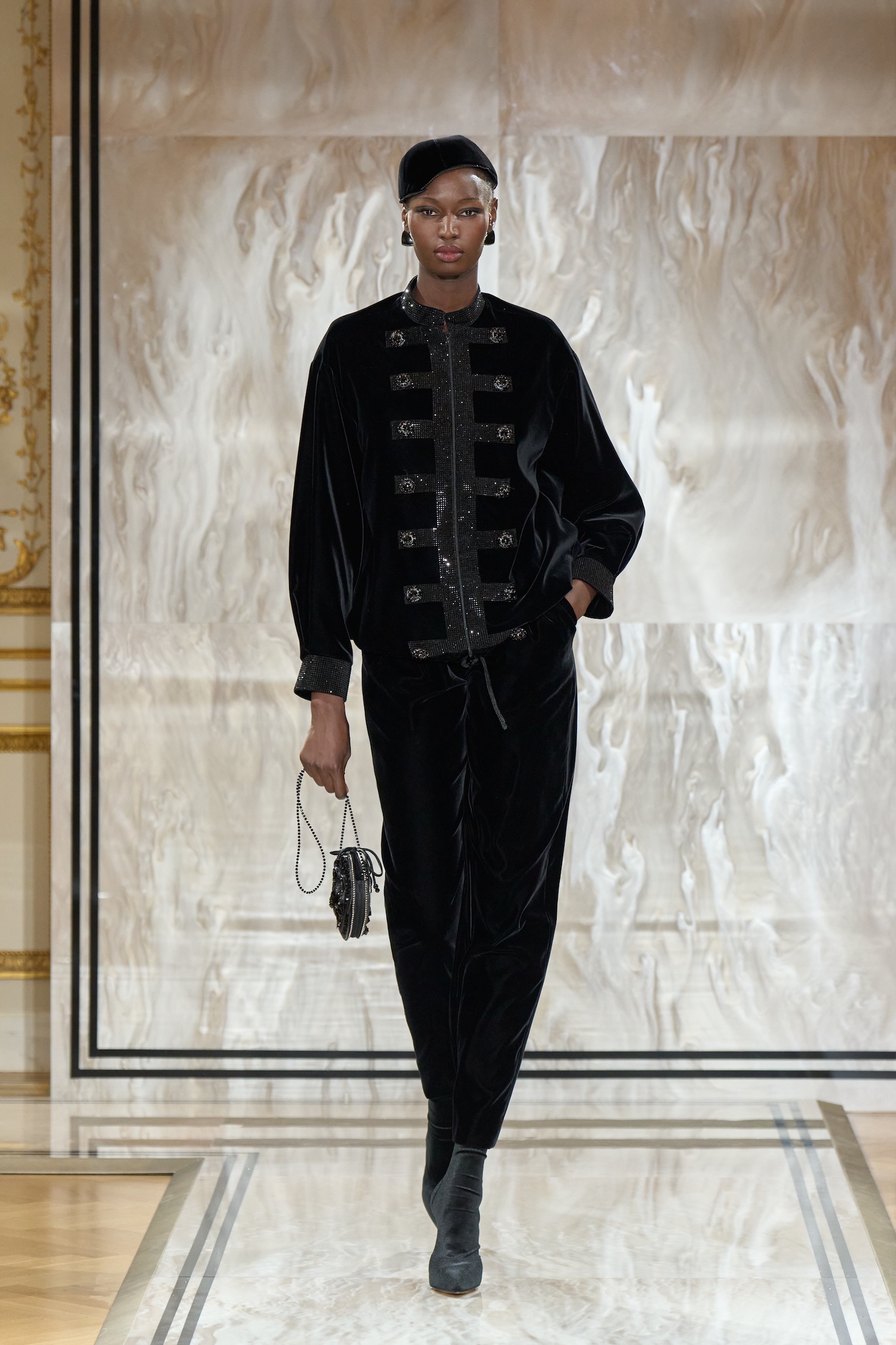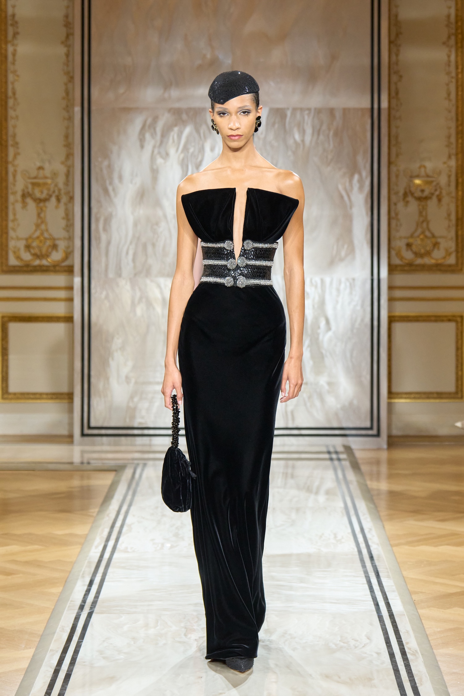 This season, Armani delved into the full spectrum of noir, featuring inky silks, matte wools, pavé crystals, oil-slick satins, and velvet that absorbed light. The show began with flashes of colour, beaded inserts that blinked in sapphire and ruby, before plunging headfirst into a world of tailored tuxedos, skin-baring blazers, and floor-grazing velvet. The result was a slick, sculpted, and deeply sensual look.