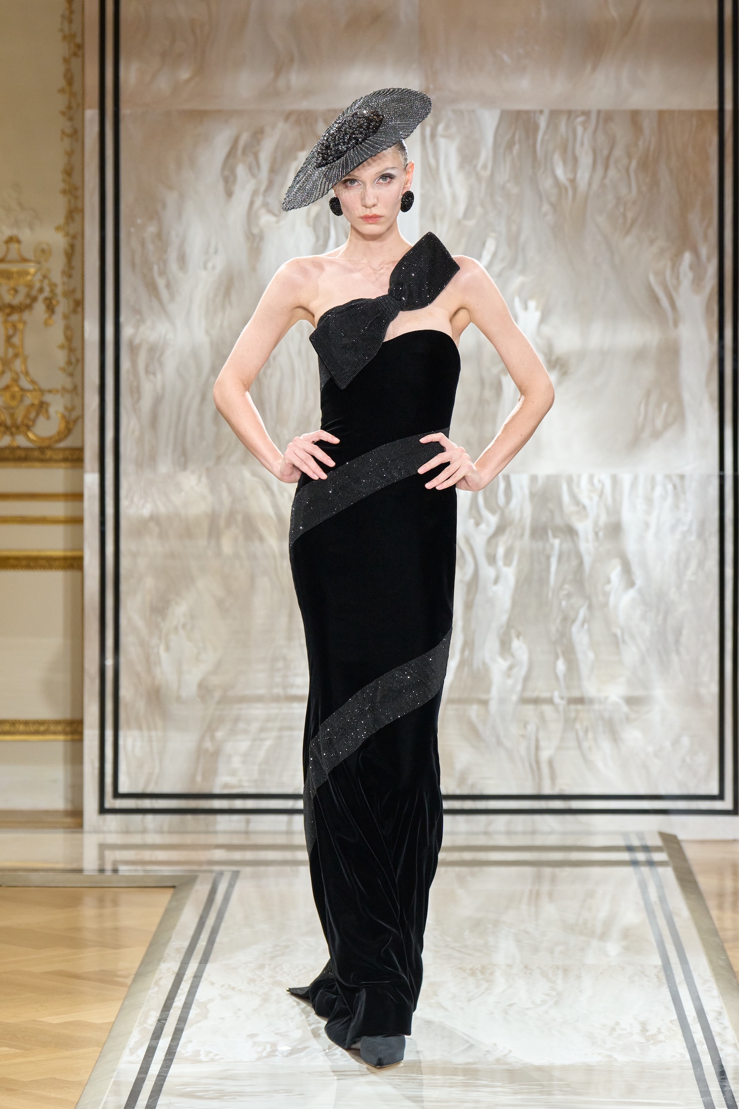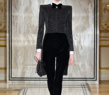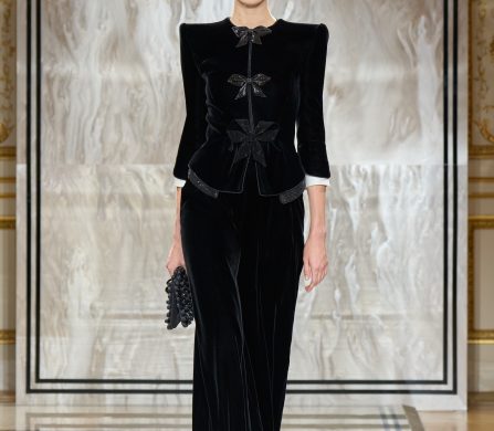 Trousers were razor-sharp; shirts crisp and white or ditched entirely. Oversized bows popped up at the shoulder or back, not saccharine but striking, like punctuation marks. There were coats lined in gold lamé (only visible in motion), and velvet dresses so dark they looked dipped in ink, their cuffs twinkling with crystals like the last embers of a cigarette.