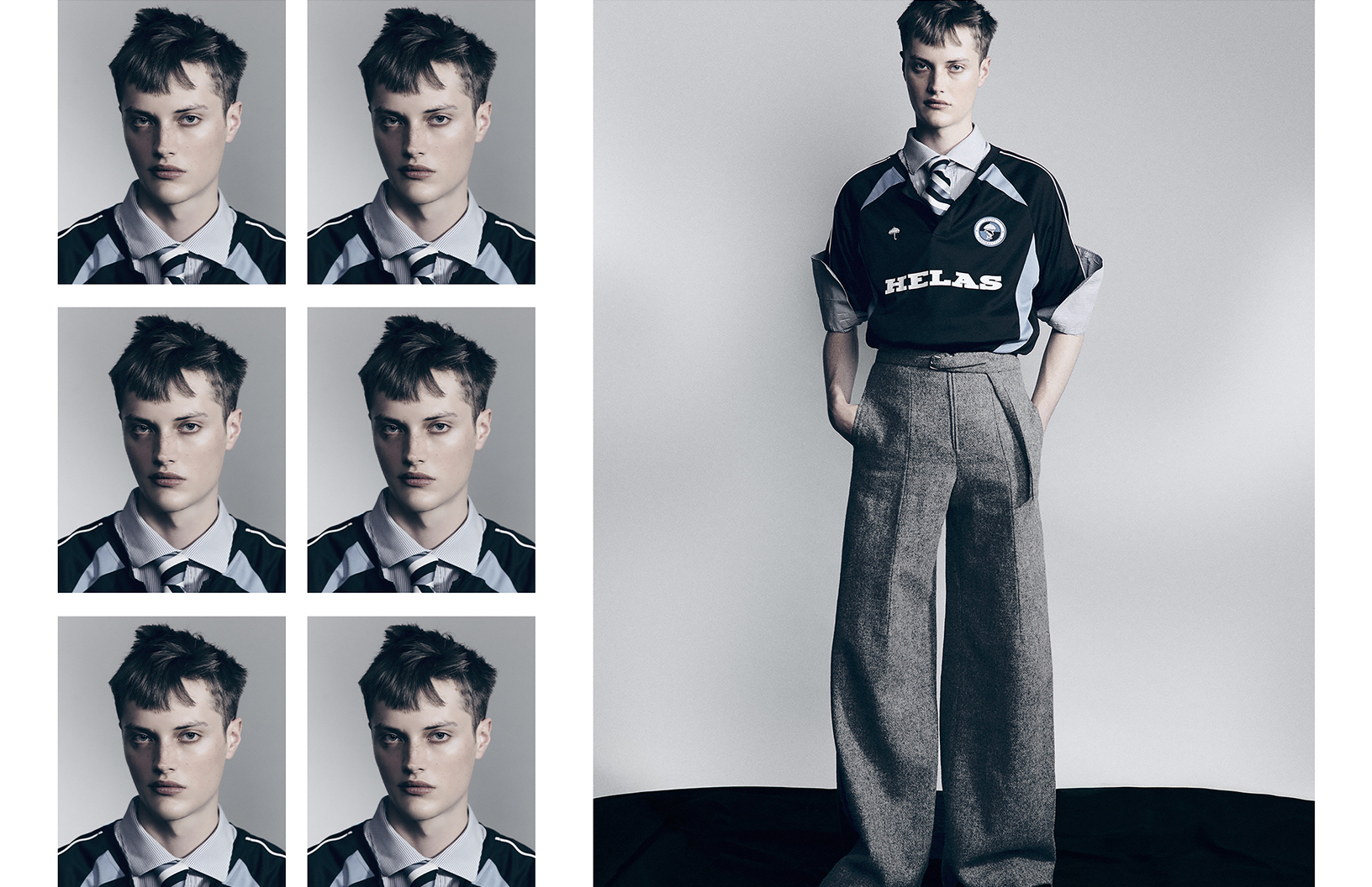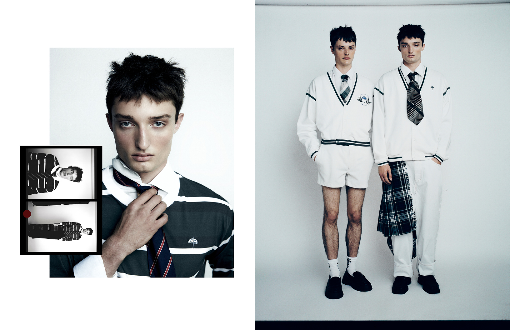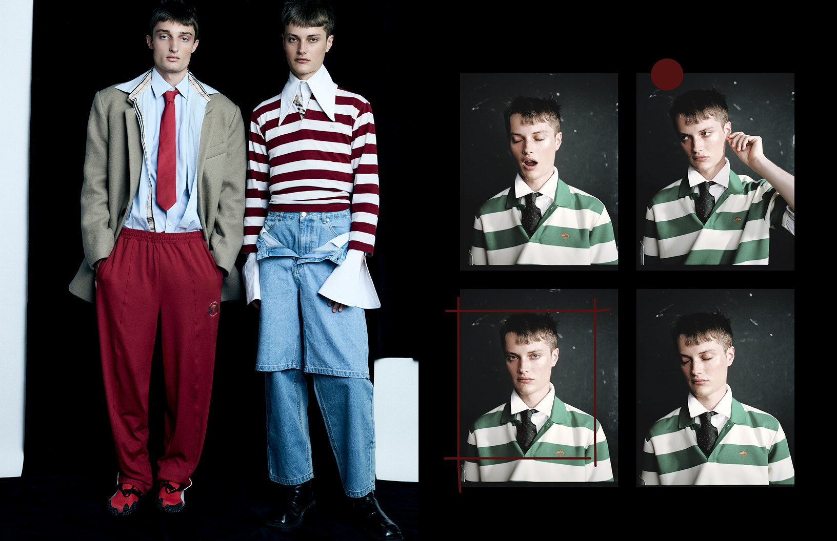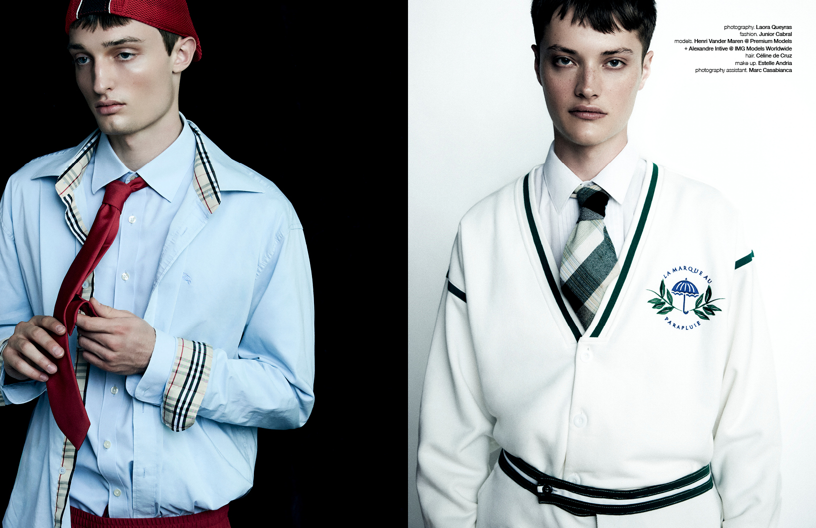 Pretty boys come in pairs in this Schön! editorial photographed by Laora Queyras with fashion by stylist Junior Cabral who dresses models Henri Vander Maren and Alexandre Intive in looks by Burberry, HELAS, Drole de Monsieur, and others. Hair by stylist Céline de Cruz with make up by Estelle Andria.