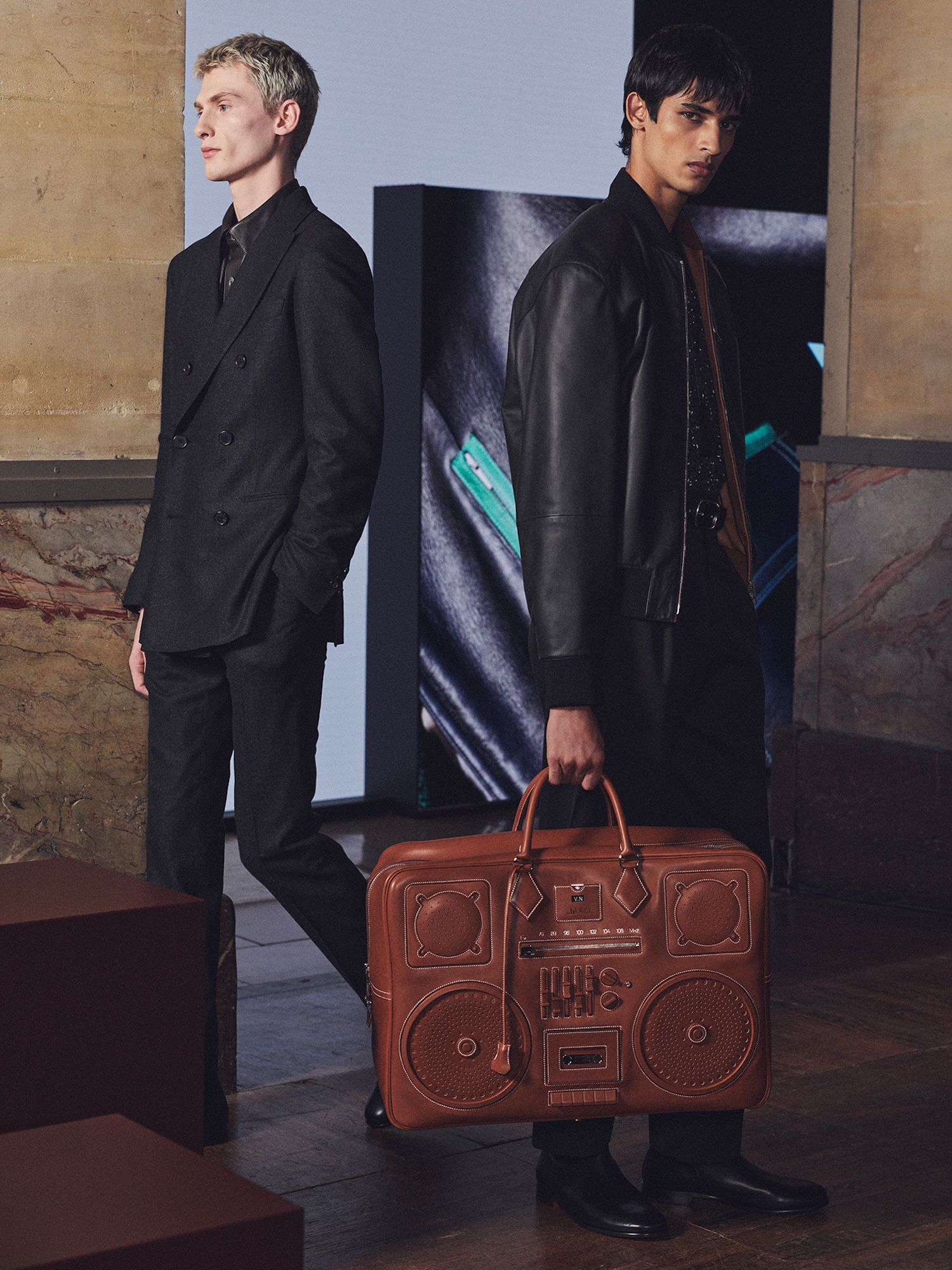 But let’s talk about the accessories, specifically the bags that had the front row leaning in. The star of the season is undoubtedly the Plume Fourre-Tout On Radio, a literal leather boombox. Whether rendered in sleek box calfskin or the rugged charm of Barénia, it manages to be both a workhorse and a sign of continued evolution for the Maison. It pairs perfectly with the elegant punctuation of Look 59, a khaki mirror crocodile suit that closed the show, offering a texture that felt almost liquid under the lights.