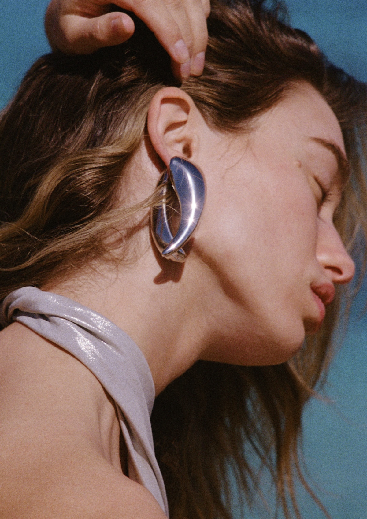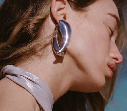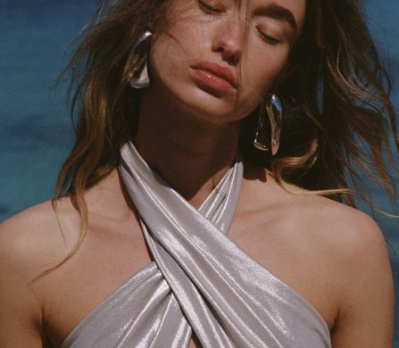 And it doesn’t stop at the swimwear. Accessories bring their own sculptural charge — oversized black sunglasses with a silver flash, gallery-worthy earrings with bold forms, a black sarong punctuated with metallic details, and a golden knit cover-up that drapes low at the hips for a little shimmer and sway.