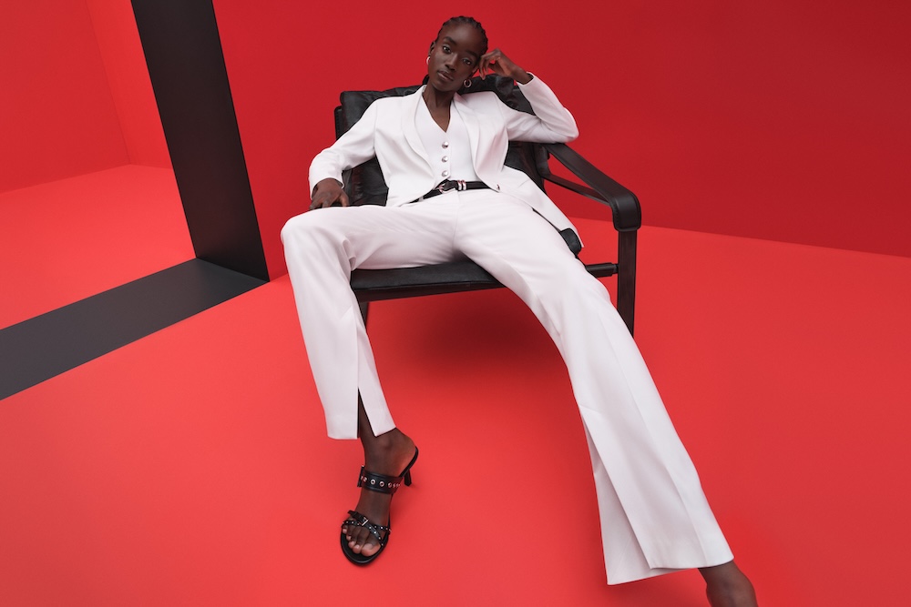 At the centre of the narrative is The GO Suit, a concept designed to make tailoring effortless and infinitely wearable. In a series of cinematic red rooms, a sharply dressed protagonist moves through different iterations of classic suiting — layering a tailored jacket over a bold print, swapping trousers for shorts, or pairing the whole look with chunky leather boots. A white three-piece suit for women makes its own statement, with close-up shots highlighting sleek belts, strappy heels, and cropped vests, reinforcing HUGO’s commitment to tailoring for all genders. The result is suiting stripped of rigid formality and reimagined for individuality — perfectly in line with the brand’s HUGO Your Way ethos.