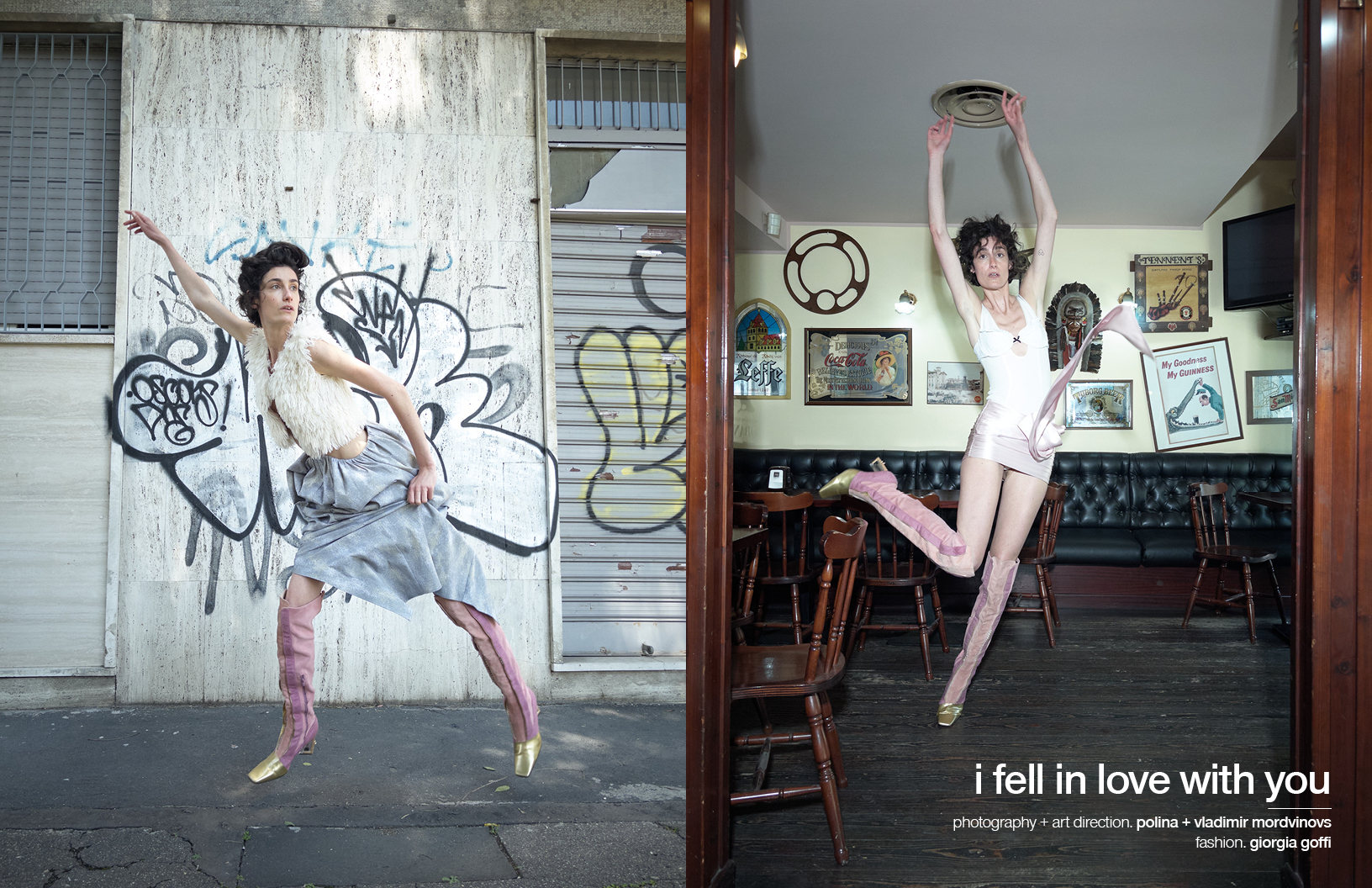 Falling in love is swift and fast in this Schön! editorial photographed and art directed by duo Polina and Vladimir Mordvinovs with styling by Giorgia Goffi who dresses Sarah Boursin in looks by Isabel Marant, Ferragamo, and others.