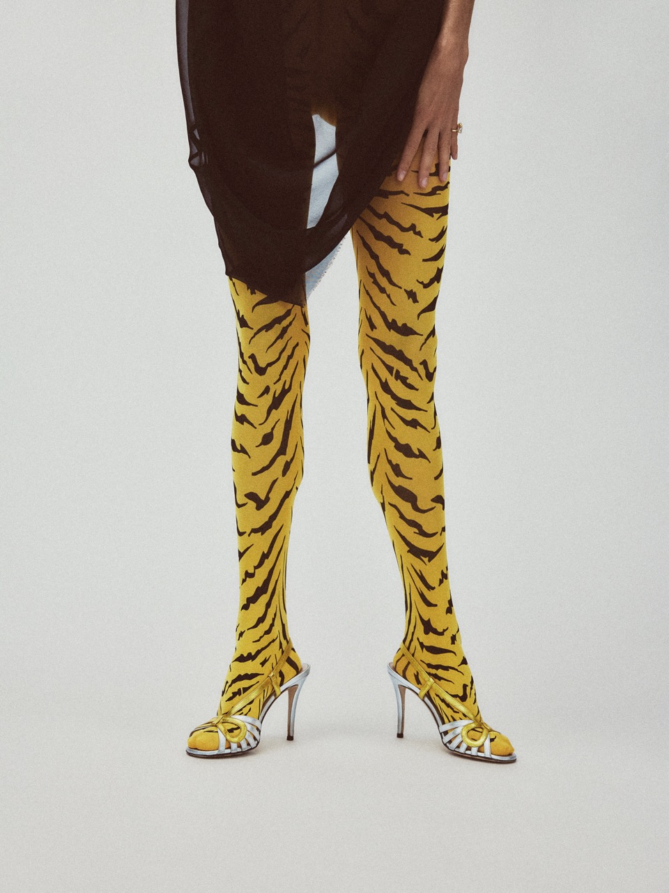 I revisited some of my favourite tights and thought: what could make these better? That’s how we ended up with super sheer white tights; the same went for some of the opaque pairs – I thought: if I were going to wear these with nothing on top, what would they have to do for my outfit? My creative process is actually quite pragmatic. Although I must say, the tiger print tights were inspired by an old photo of Chloe Sevigny… I think from the late 90s.