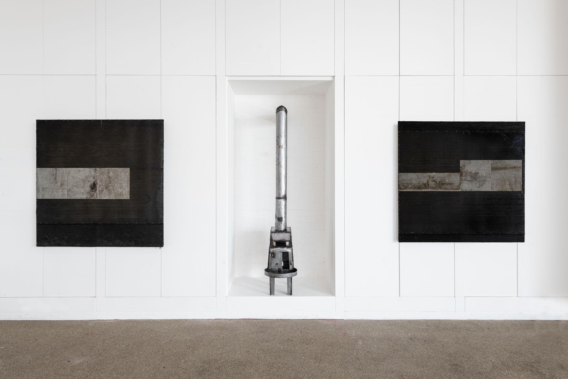 Your materials — torch-down rubber, roofing tar, staples — are not traditionally “fine art.” What role does this industrial, utilitarian palette play in your critique or reimagining of America?