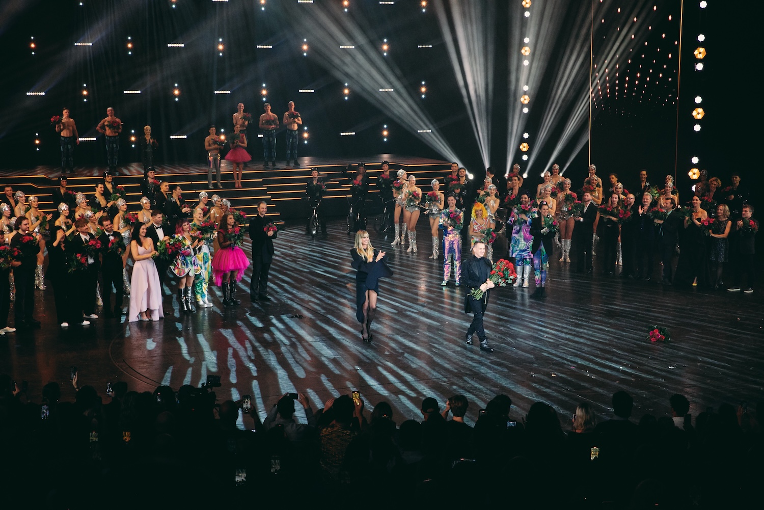 This personal passion is visible in the details (and the sparkle). The Palast’s legendary 32-piece Kickline, the ultimate emblem of the revue, shimmered thanks to being encrusted with over 4 million Swarovski crystals. The spectacle also resurrected fashion history, featuring meticulous duplicate recreations of the iconic candlestick dress Scott originally designed for Katy Perry’s 2019 MET Gala.