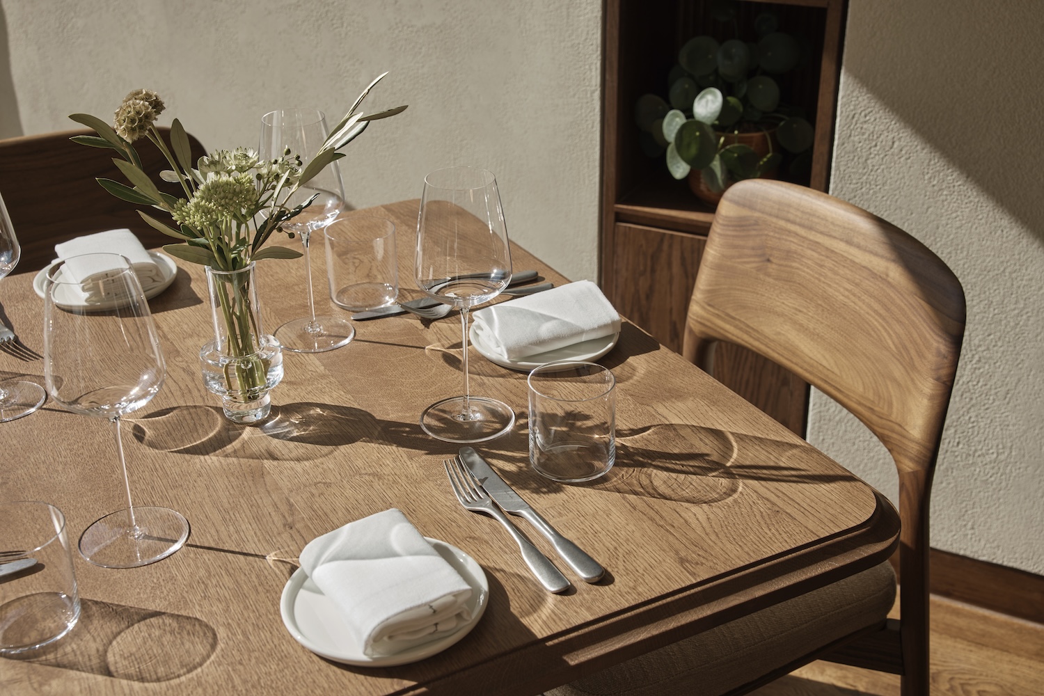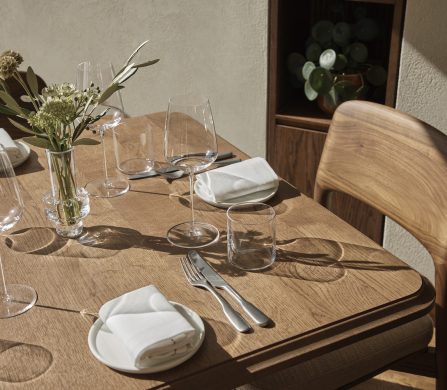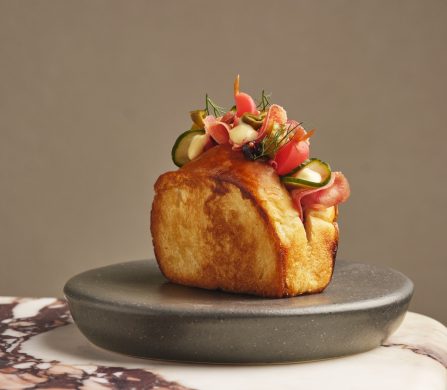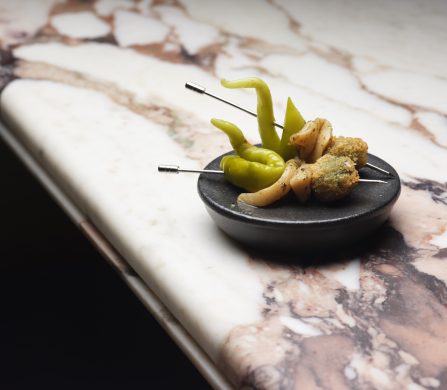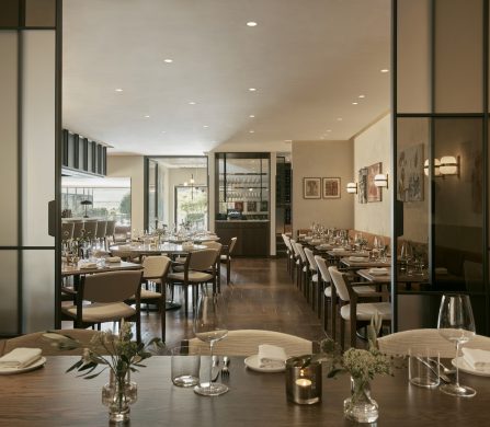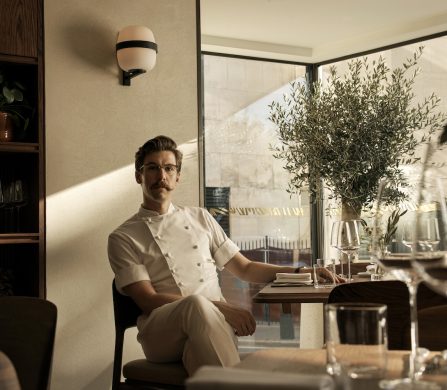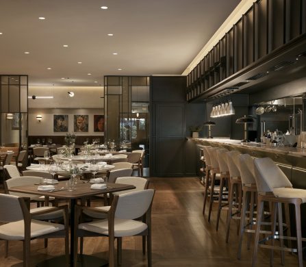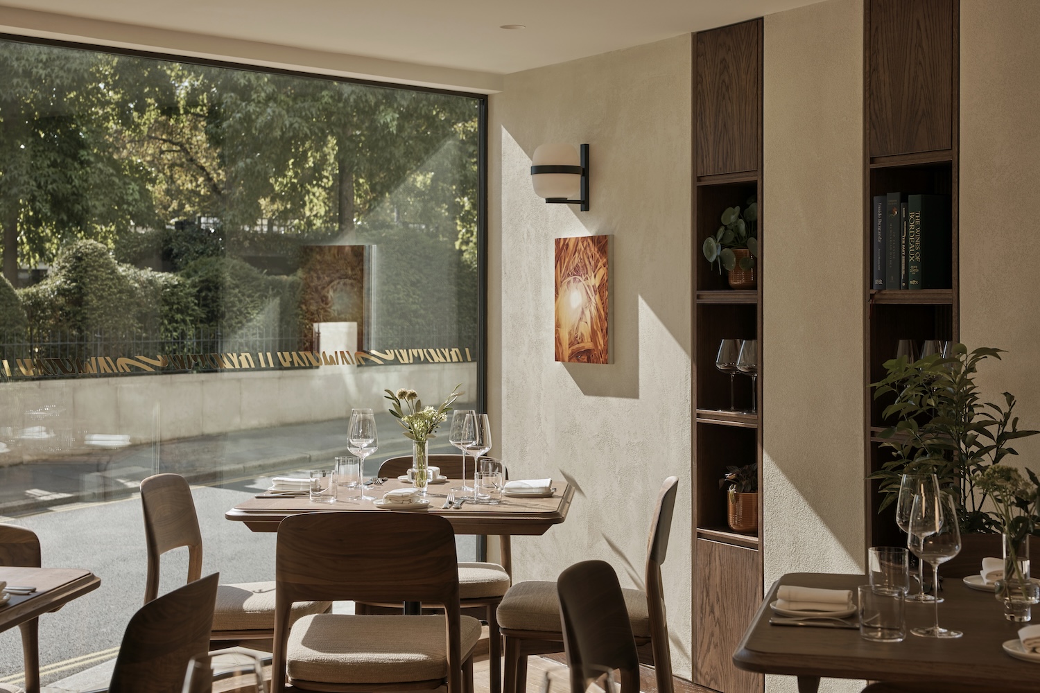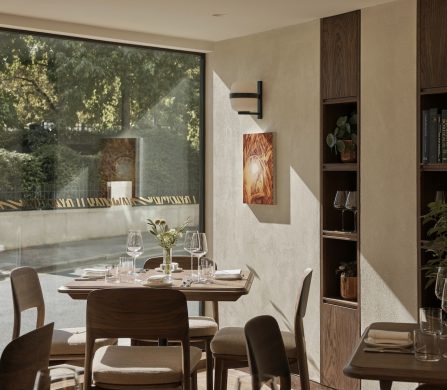 Labombe’s interiors, designed by Trivet’s long-time collaborator, Turkish architect Umay Çeviker, reflect this warm sophistication. Guests are immediately greeted by an impressive glass-enclosed wine cellar showcasing over a thousand bottles, while the open kitchen and bar create an interactive and welcoming atmosphere. Cognac suede banquettes, Calacatta Viola marble and natural wood set a subtle stage, while works by emerging British artists bring colour and energy.