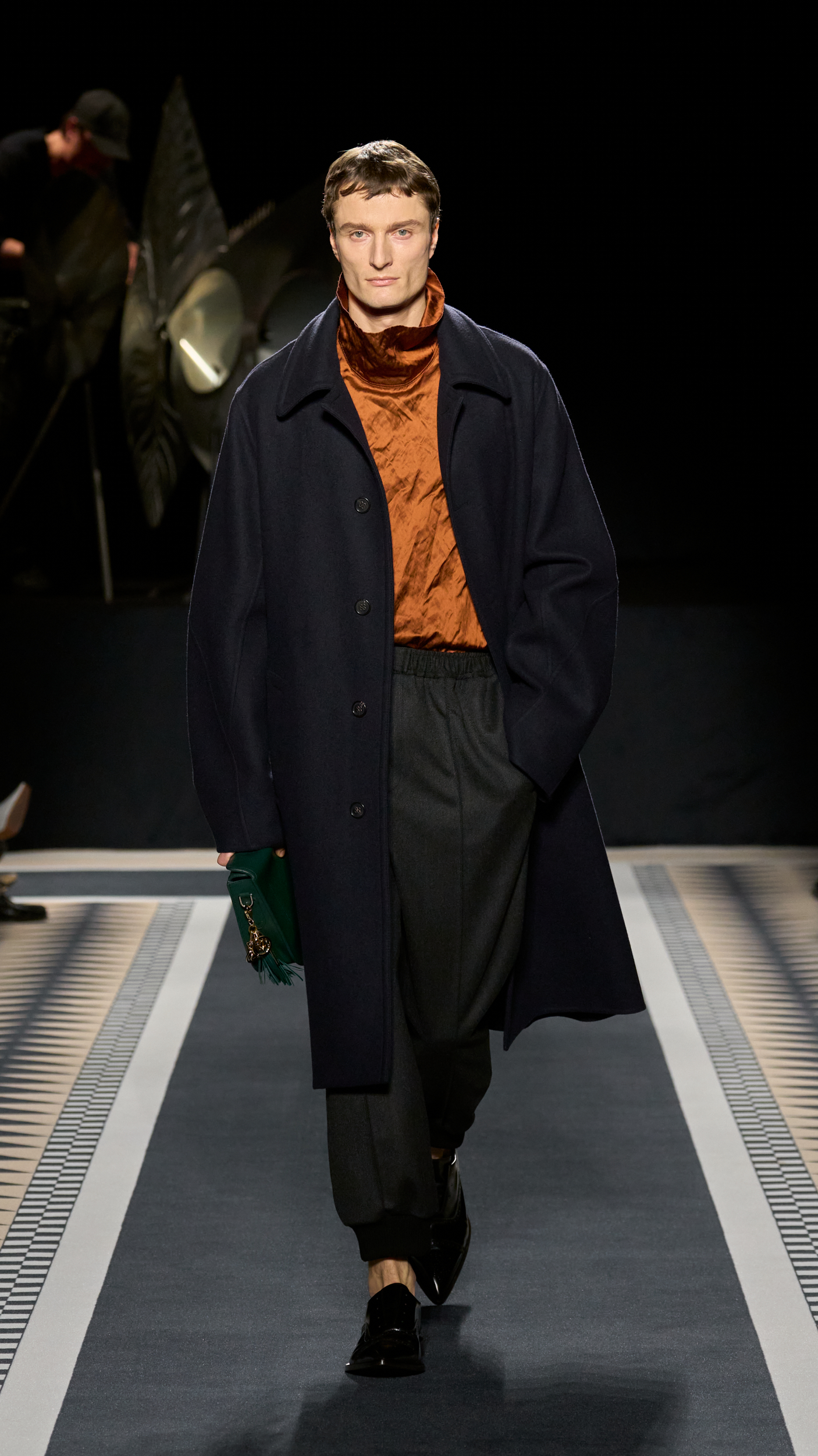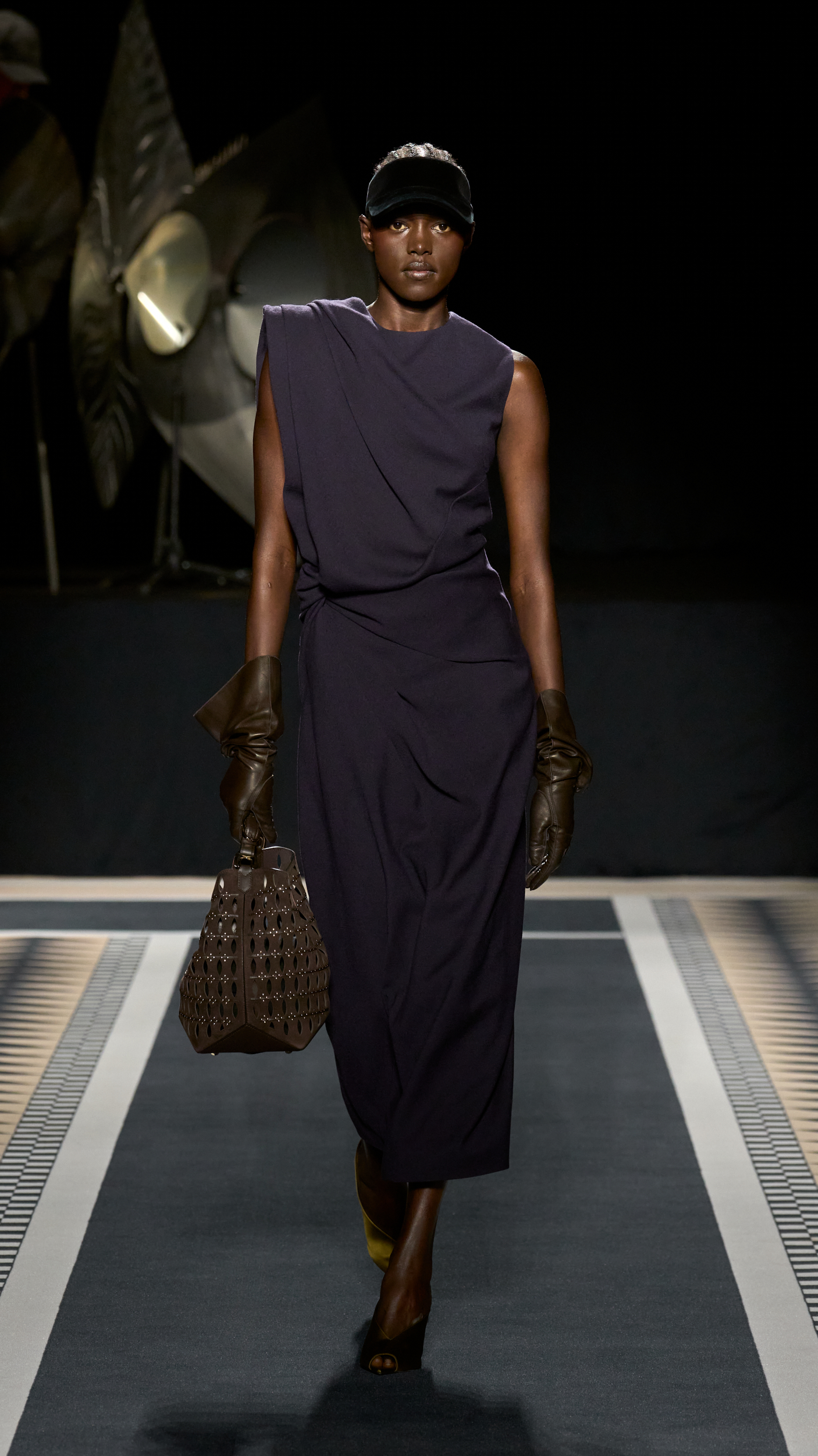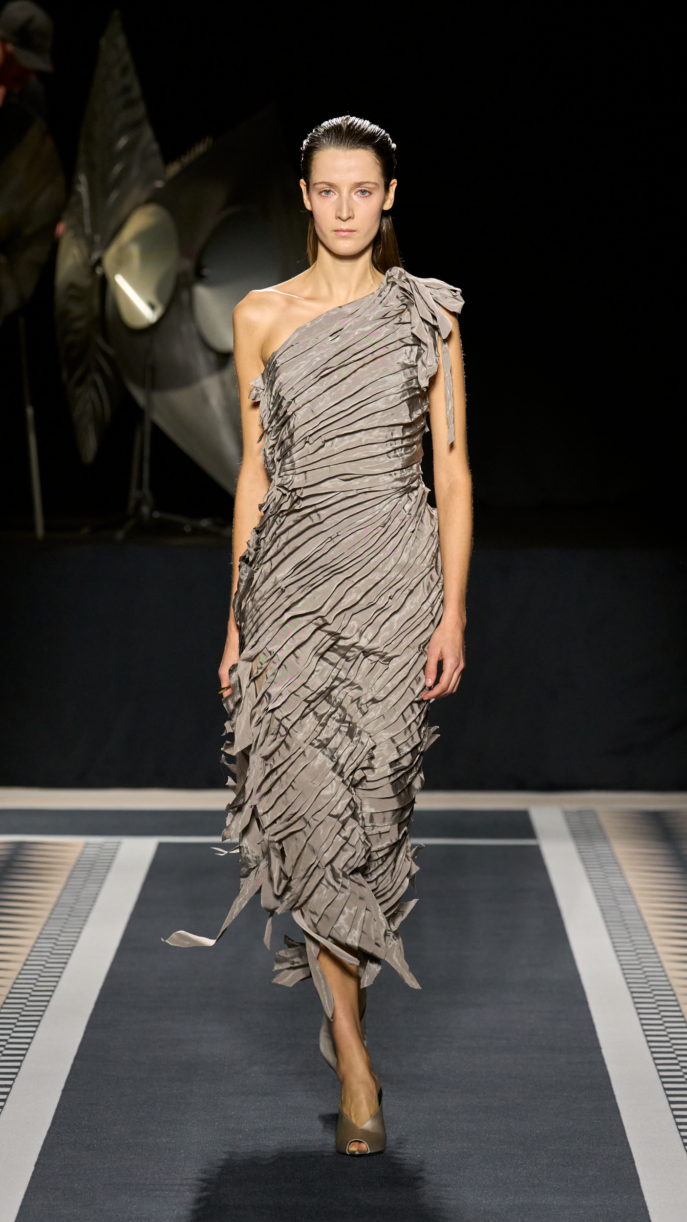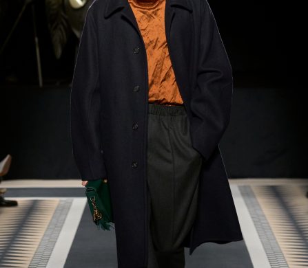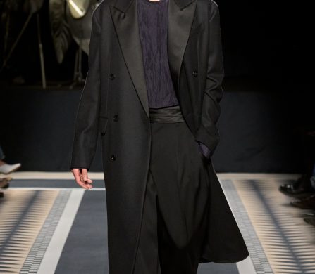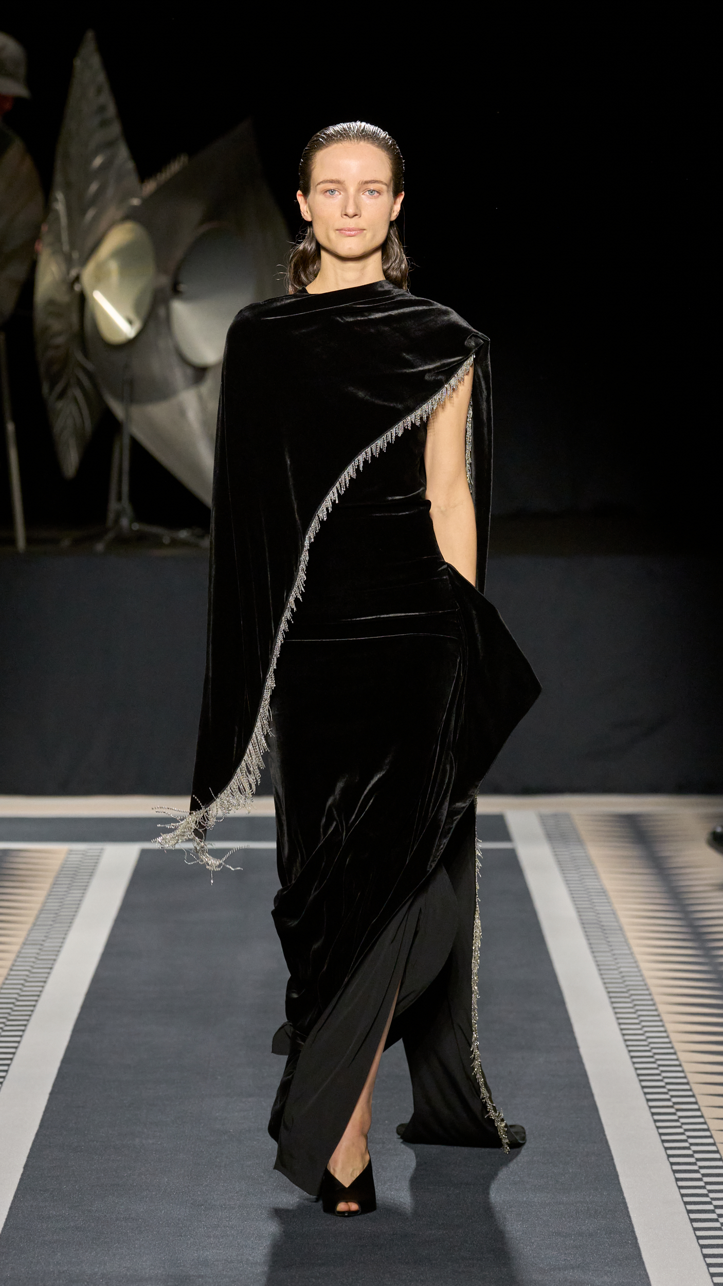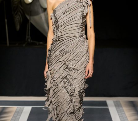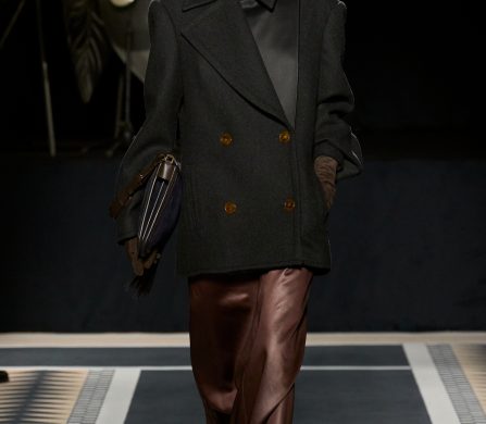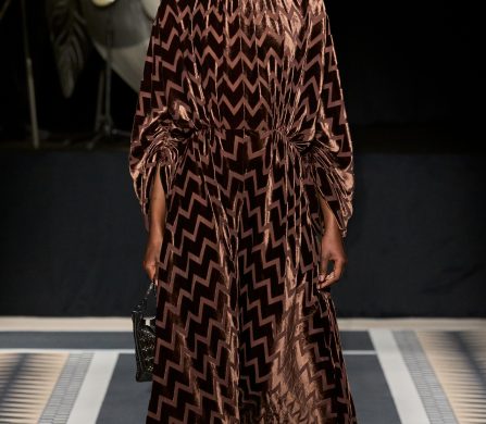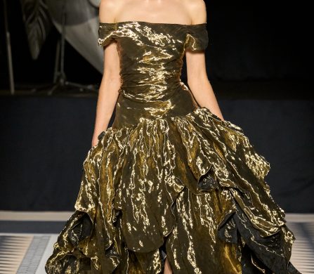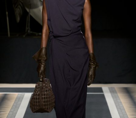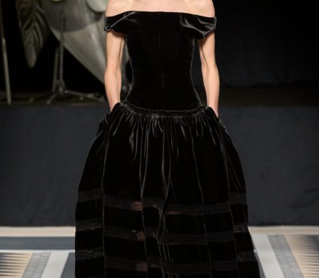 Structured coats, trenches, and blazers are styled alongside fluid satin midi skirts and turtleneck tops; velvet chevron-printed flowy and body-hugging pleated dresses, both flowy and body-hugging, are delicately ruched to create shape; and diamante tassels and sequins embellished jumpers, dresses, and capes. The final look, though, still manages to steal the show. Floating ethereally down the runway, the gold drop-waist midi dress with an off-the-shoulder bodice reflects the light magically, embodying Lanvin’s couture sensibility and individuality.
