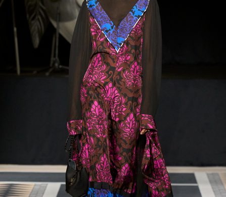 Updated archival styles – embroidery reworked onto t-shirts and jumpers and classic silhouettes afforded more volume – aren’t the only way the collection highlights the brand’s past. The Lanvin emblem, designed by Paul Iribe in 1923, is represented through a diverse cast of models, new emblems draw inspiration from the interiors of Jeanne Lanvin’s home, and the house’s signature blue – originally influenced by the 15th-century frescoes of Fra Angelico – has also evolved. And, if you look closely, you can spot the shapes of J’s and L’s integrated into the designs of garments, accessories, handbags, and heels.