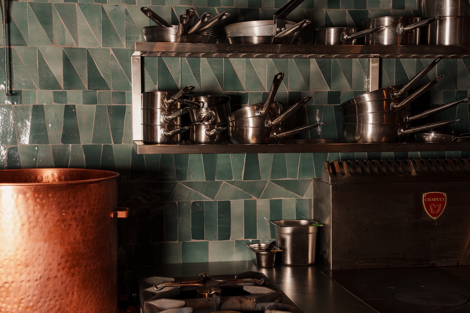 Legado invites you into its double-height dining room, where London Stock brick merges with sage-green tiles, and sunlight floods through high ceilings. You begin in the Taberna, a bright, welcoming bar and terrace built under a fluted arch that mimics Barcelona’s curves. Tapas, pintxos, and local wines flow into the show kitchen, where counter seating for 16 frames the ovens and the chefs behind them.