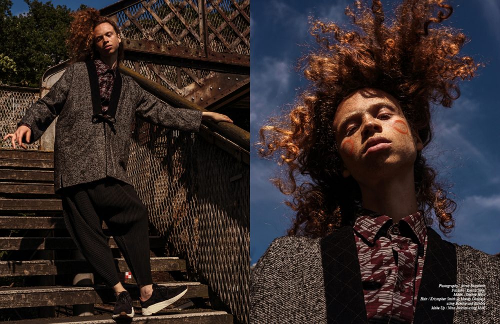 Photographer Arron Dunworth brings us into the isolation of urban landscape in this Schön! online editorial. Fashion byKoulla Sergi sees modelGeorge Hard in ample airy styles mirroring the colour of the first fallen leaves clad in Acne Studios, Missoni and Issey Miyake.