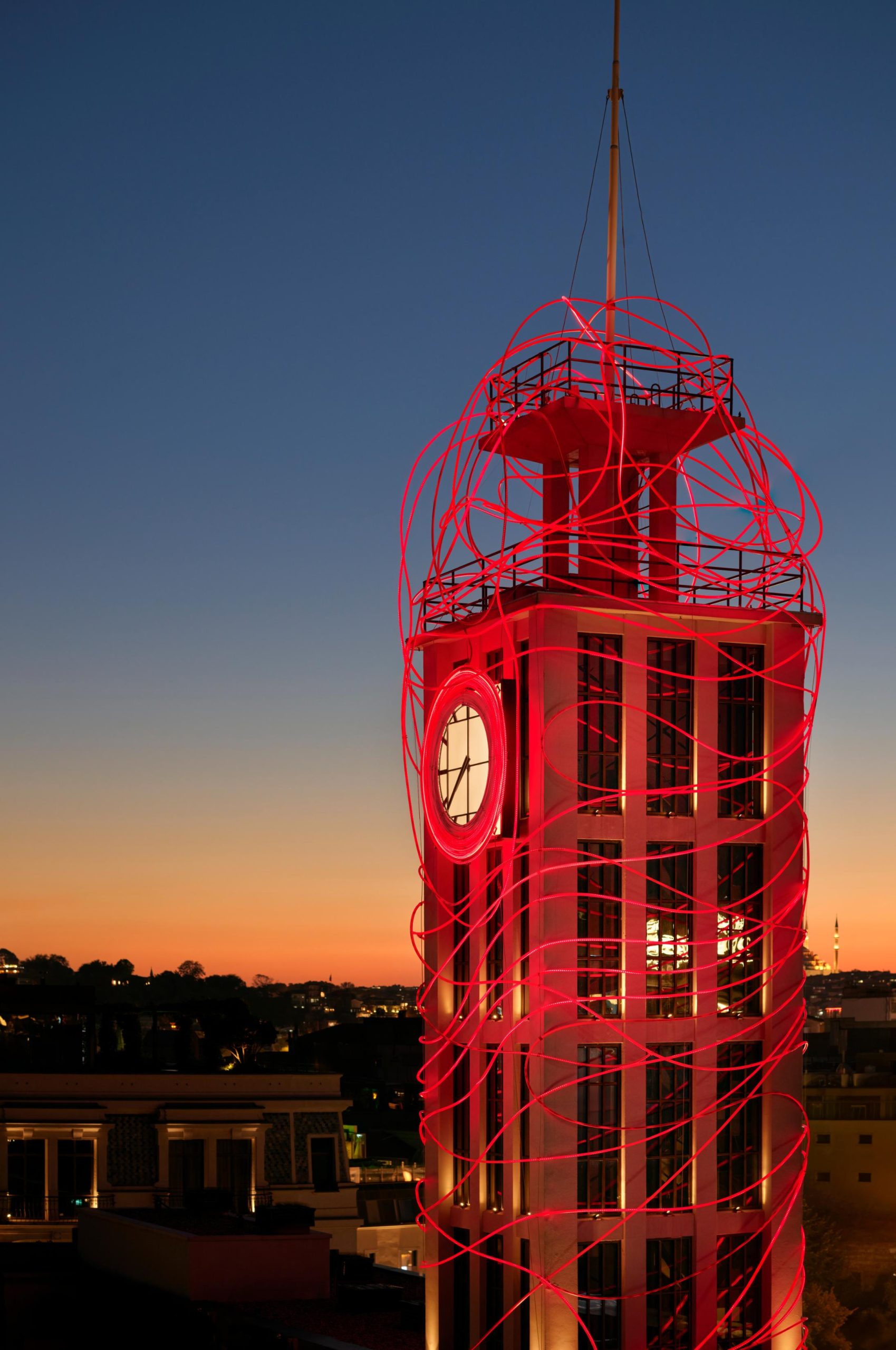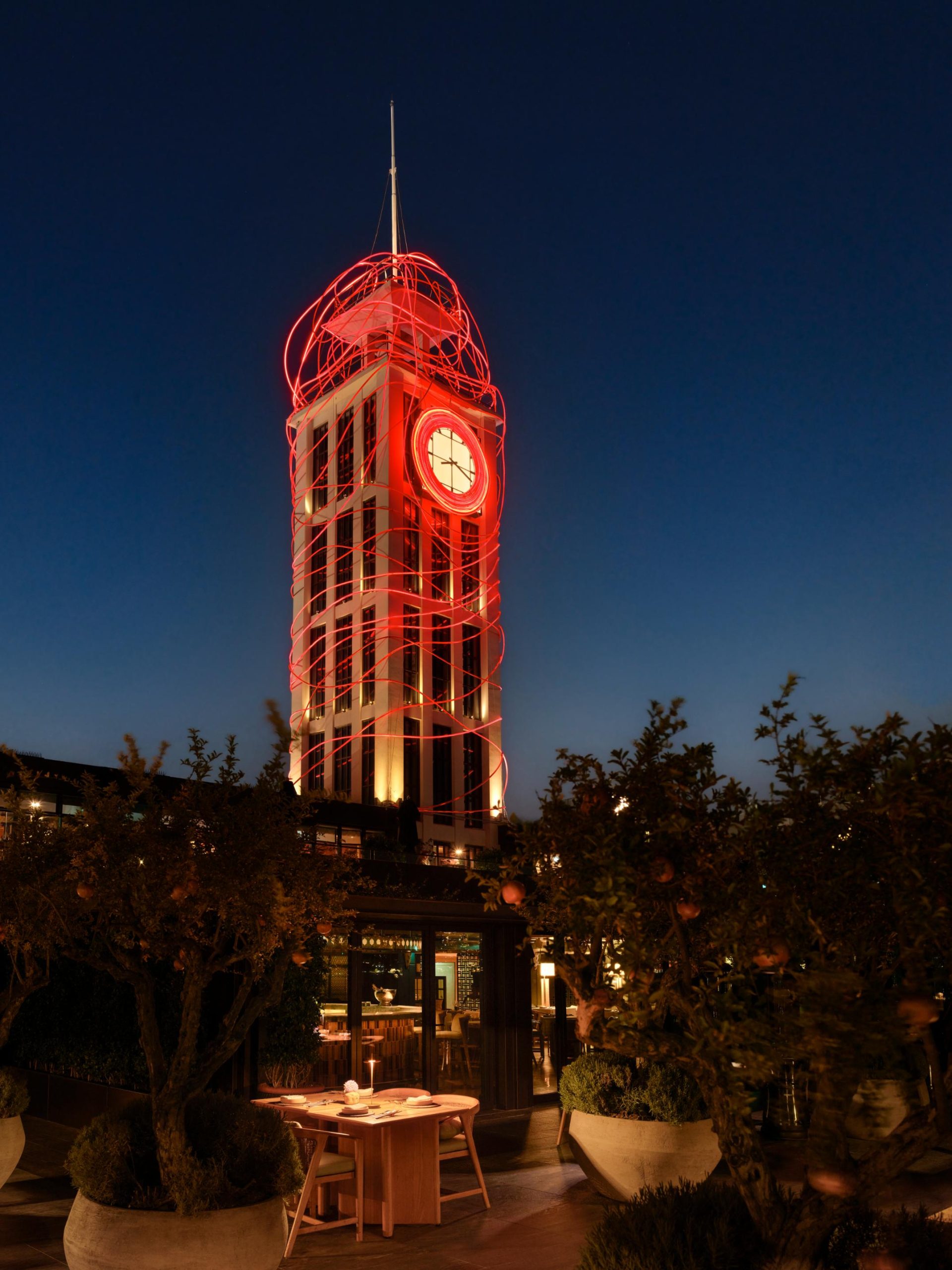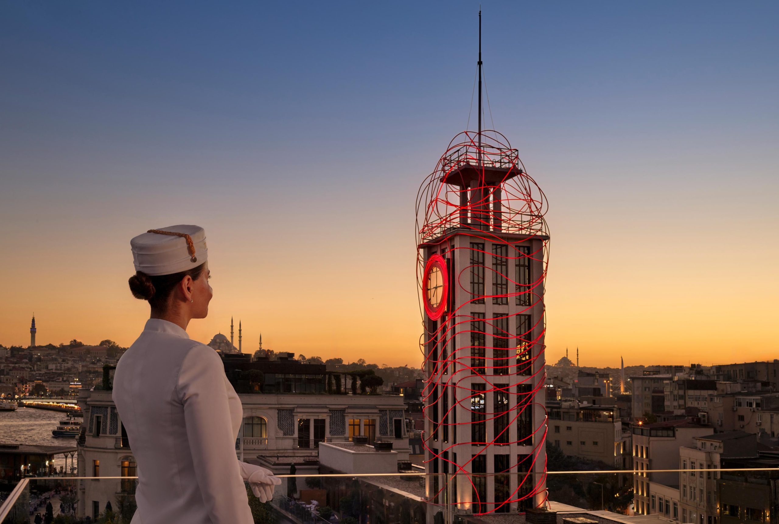 Known for her monumental light sculptures that explore human connection and the rhythm of place, Grimanesa Amorós draws deep inspiration from Istanbul’s maritime heritage. The first piece, PASSAGE, illuminates the hotel’s historic clock tower. Within this century-old structure, light flows in choreographed motion, echoing the emotional energy of arrivals and departures once experienced at the site — originally built in the 1910s as a passenger terminal for Bosphorus ferries.