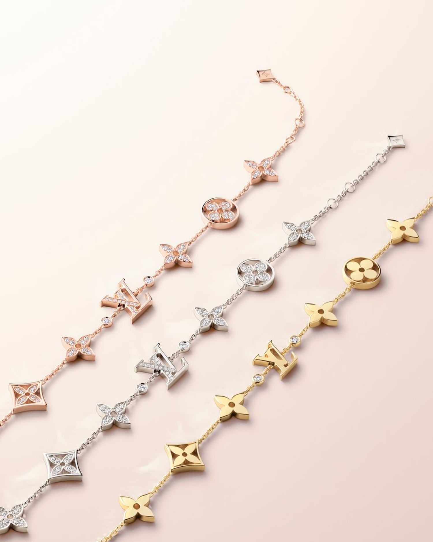 The bracelets take on different tones: a pink gold bangle with two bezel-set diamonds, minimal but meticulously worked; a pair of pavé-diamond styles in white or pink gold that bring a bit more flash without overpowering the design. In each design, the LV initials are treated as part of the composition, simply becoming another shape in the language of the jewel.