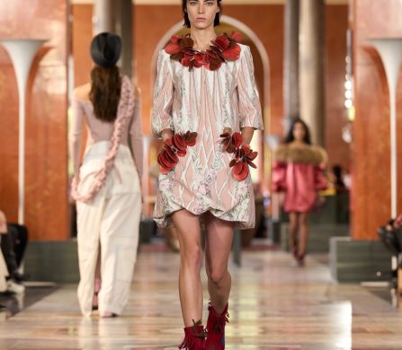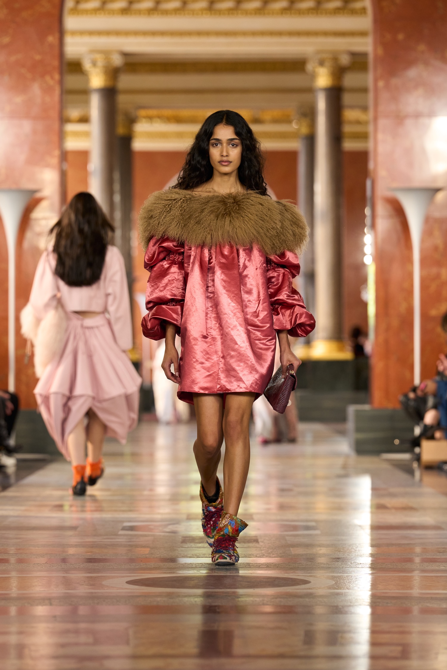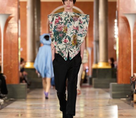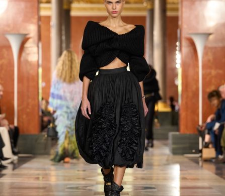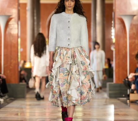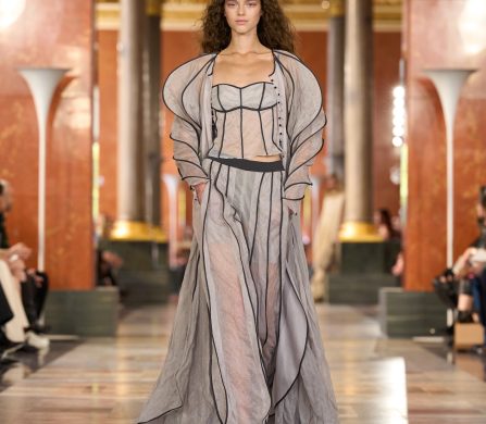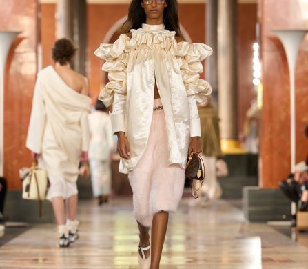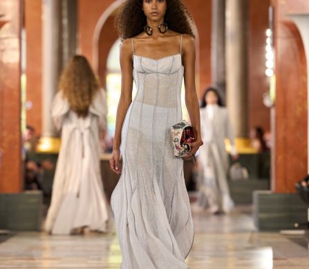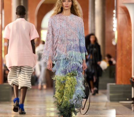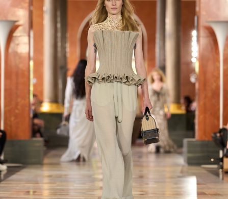 Under Ghesquière’s direction – a man whose singular, 12-year tenure at the house is a rare constant in an industry defined by shifting leadership – the SS26 lineup dismantled genre archetypes, opting for a “celebration of intimacy and the boundless freedom of the private sphere.” Pajama trousers, robe-coats, and slipper-like shoes – pieces usually reserved for the home – appeared with refined confidence. Knit shorts and sculptural sleeves recast comfort as couture, subverting the etiquette of “indoor” dressing and embracing freedom within the private sphere. Ghesquière revisited his core vocabulary, but always reframed: the romantic drama of Juliette sleeves and the structure of corseted silhouettes appeared in a way that felt light, dynamic, and modern. Later looks became bolder and more dramatic, including a crystal-covered furry jacket with a ruffled peplum hem and an intricately beaded fringed gown.