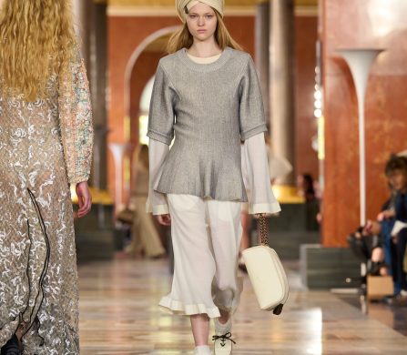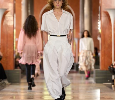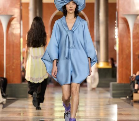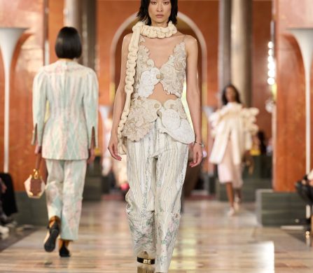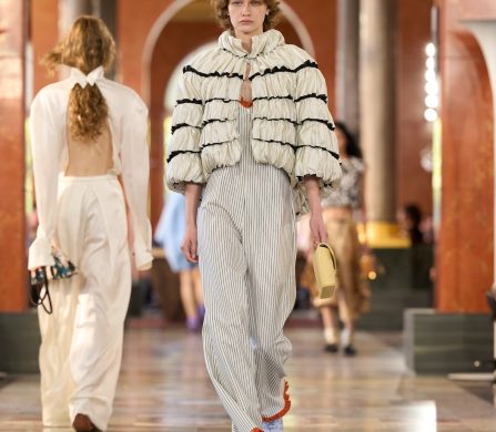Scenographer Marie-Anne Derville transformed the royal chambers into a contemporary apartment, a collage of eras that pulled French taste across centuries into one room. Eighteenth-century furniture by Georges Jacob sat alongside Art Deco chairs by Michel Dufet, Dalpayrat ceramics from the 1800s, and Derville’s own creations. The effect was a space where personal histories and aesthetics collide, the perfect foil for Nicolas Ghesquière’s exploration of the “indoor wardrobe.”
