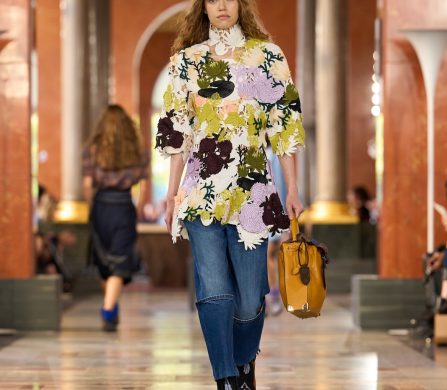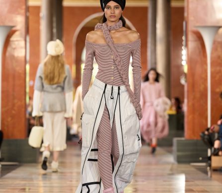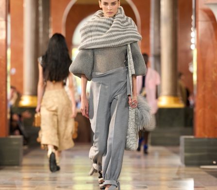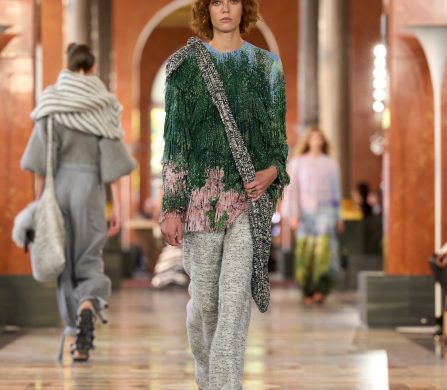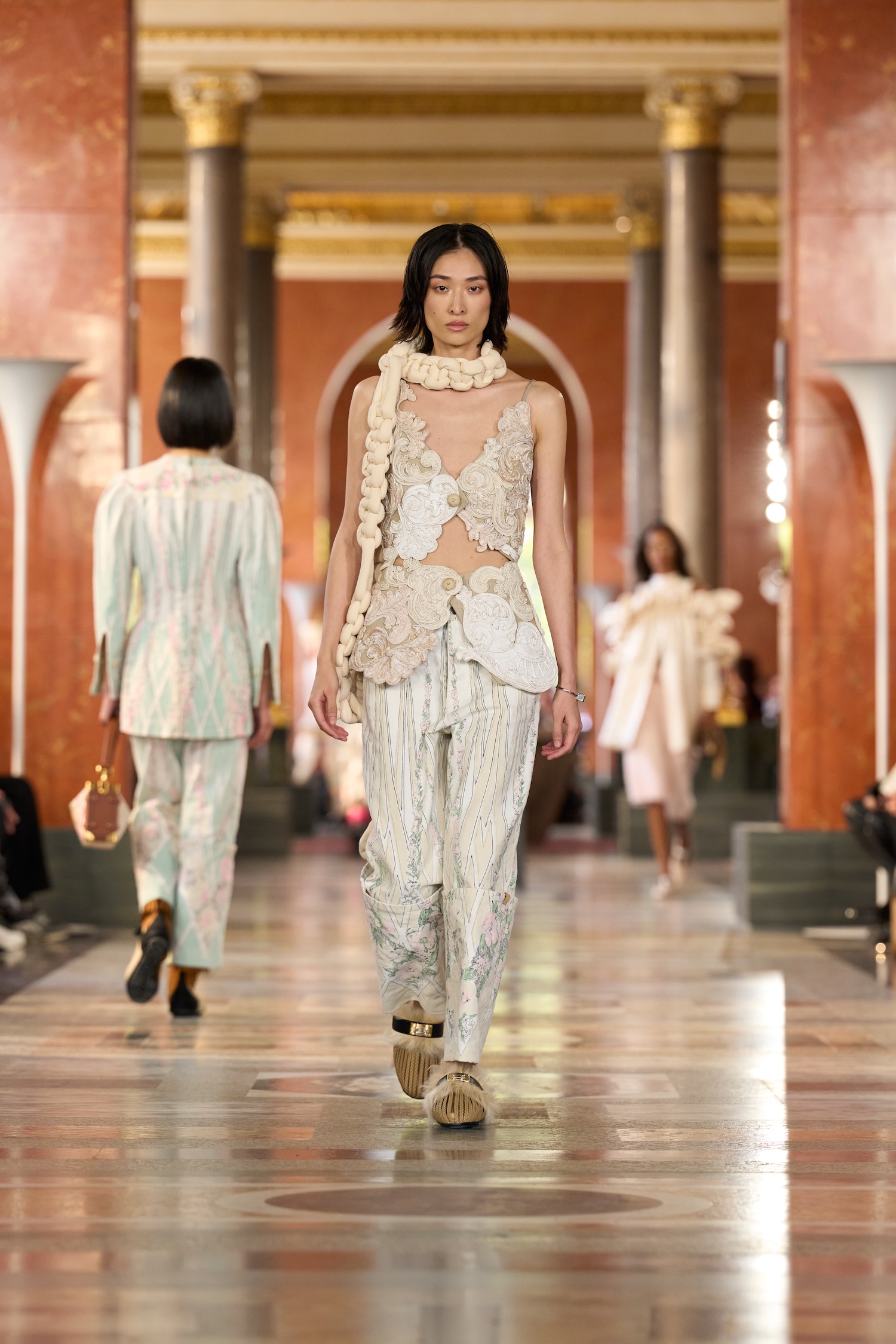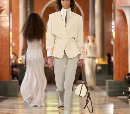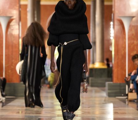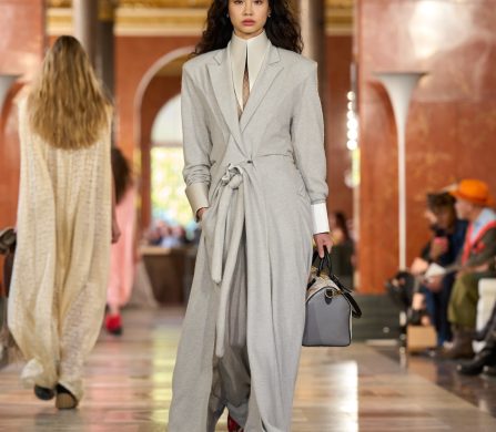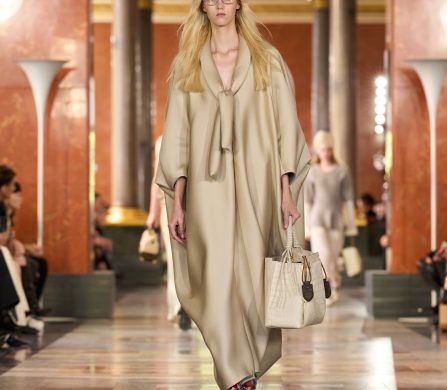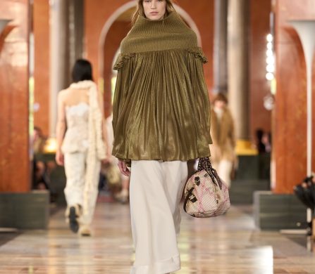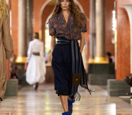 Iconic bags like the Express Bag made a significant return to the runway, along with the Speedy and the Side Trunk MM, all rendered in new patterns and treatments. Finally, the collection’s jewellery and metalwork cantered on a chic utility, most memorably with a sophisticated gold chain worn as a waist belt that incorporated a functional timepiece, adding a delicate yet unexpected layer of ornamentation to the fluid, loungewear-inspired silhouettes.