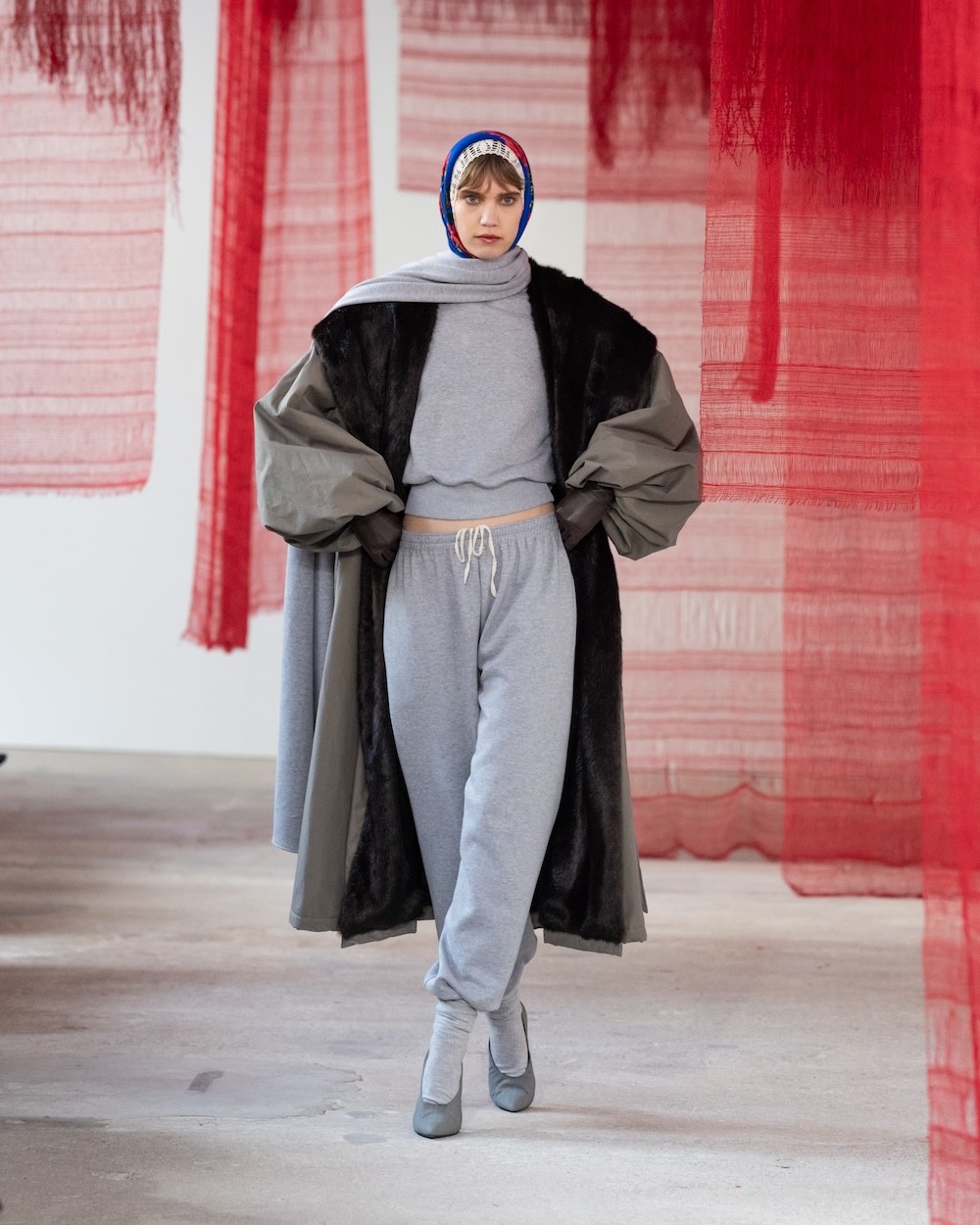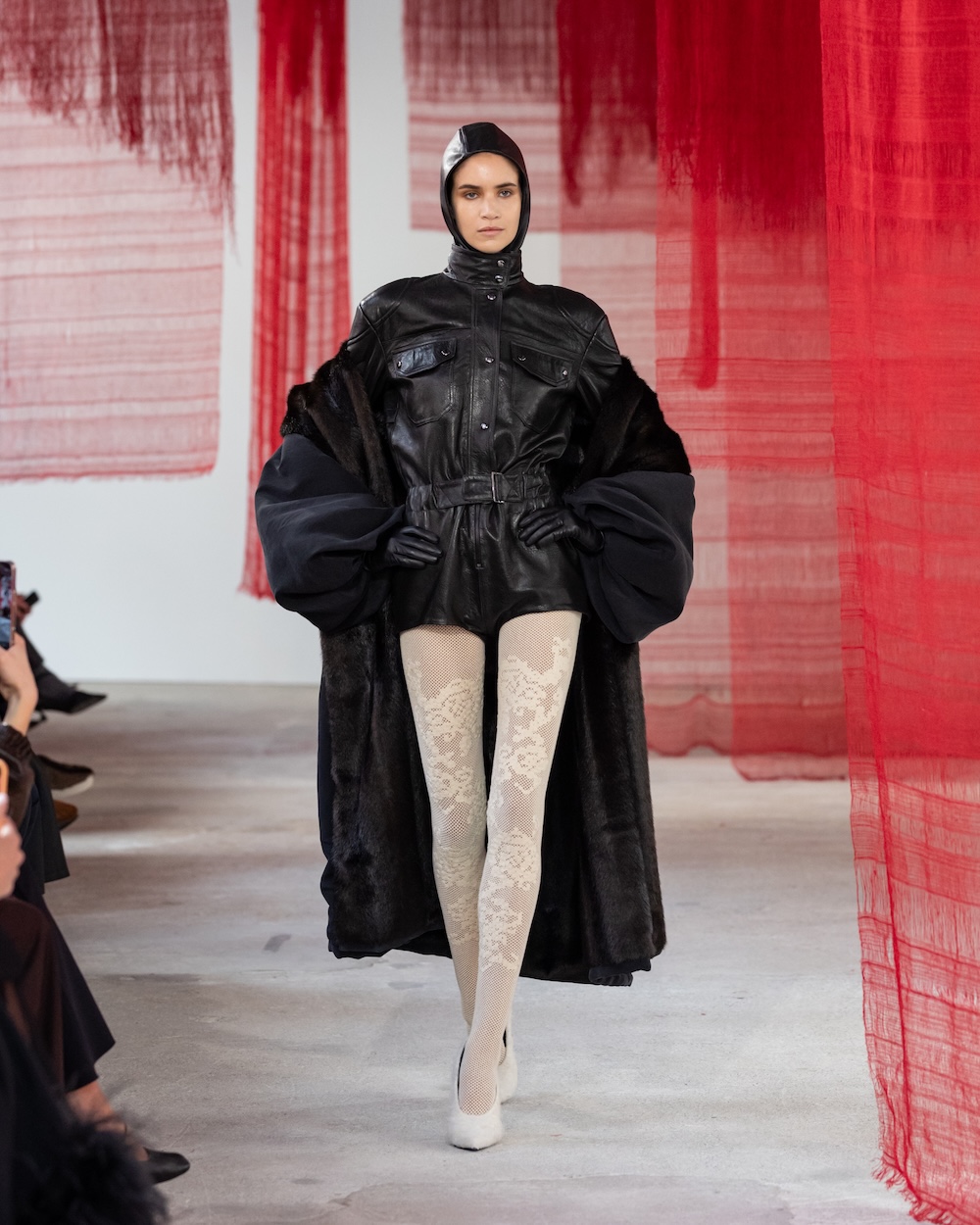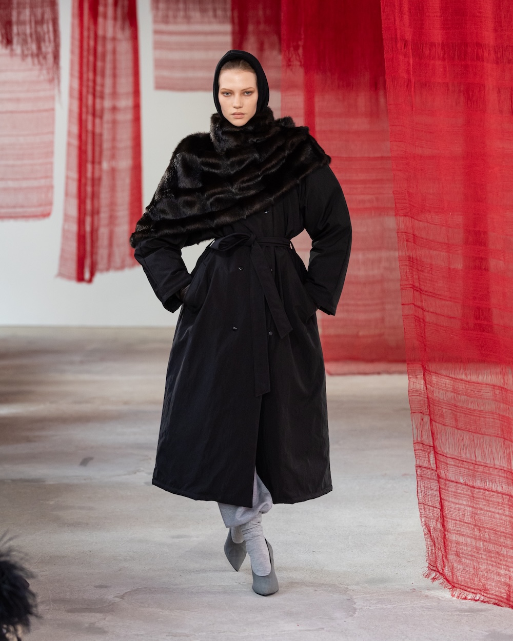 Beyond the romance, Magdalena also captures Butrym’s everyday sensibilities. There is a rugged practicality in raw shearling coats thrown over slinky tracksuits, in fur shawls wrapped around duvet jackets. Traditional Slavic motifs surface in floral headscarves, while sculpted black dresses take cues from Polish folk costumes — reimagined with a powerful, hourglass silhouette. Butrym also cites Peter Lindbergh’s photography as a reference, translating his stark, windswept heroines into modern-day muses who walk through life with quiet confidence.