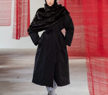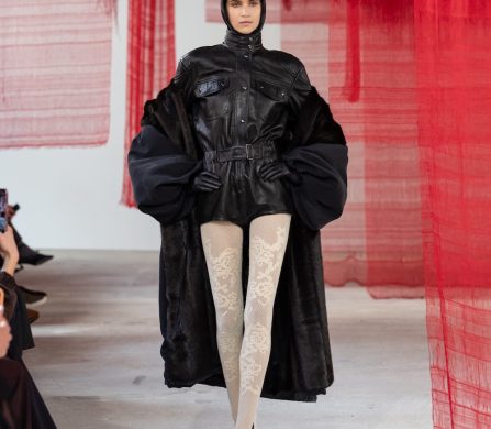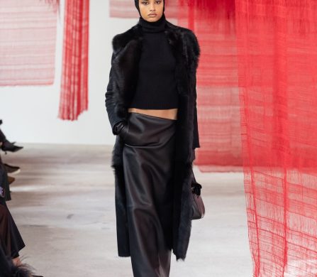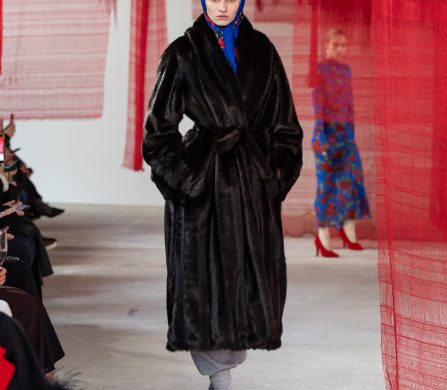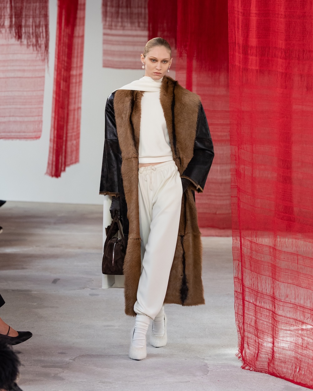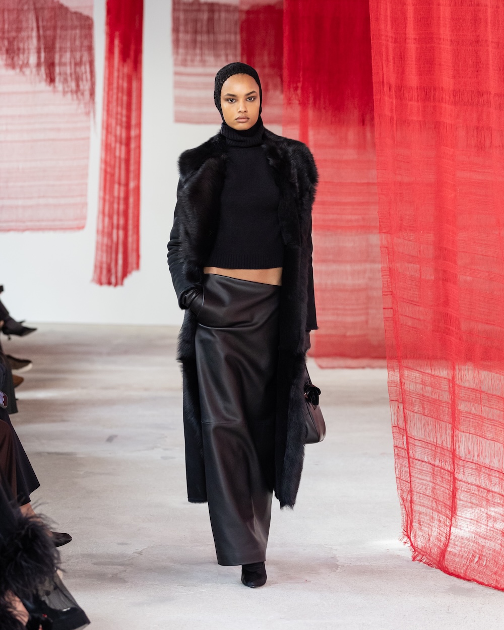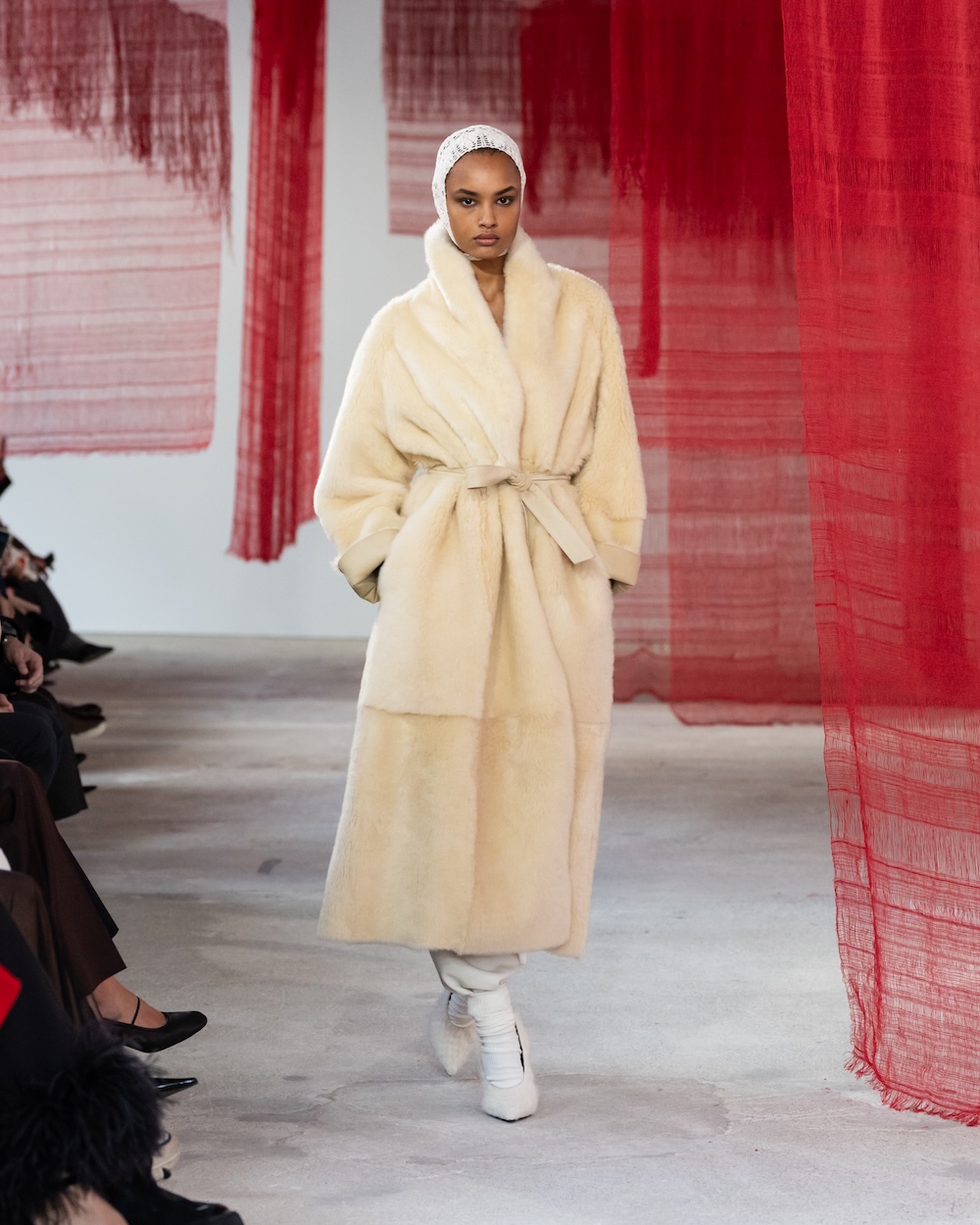 Beyond the romance, Magdalena also captures Butrym’s everyday sensibilities. There is a rugged practicality in raw shearling coats thrown over slinky tracksuits, in fur shawls wrapped around duvet jackets. Traditional Slavic motifs surface in floral headscarves, while sculpted black dresses take cues from Polish folk costumes — reimagined with a powerful, hourglass silhouette. Butrym also cites Peter Lindbergh’s photography as a reference, translating his stark, windswept heroines into modern-day muses who walk through life with quiet confidence.
