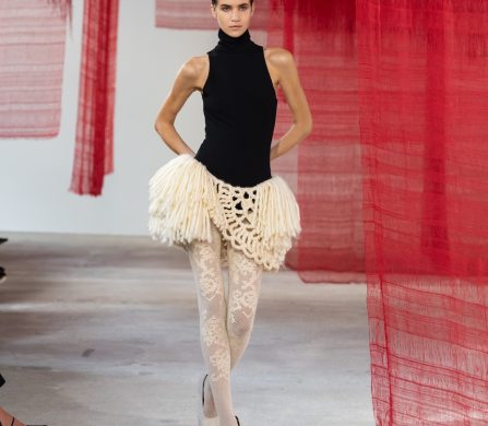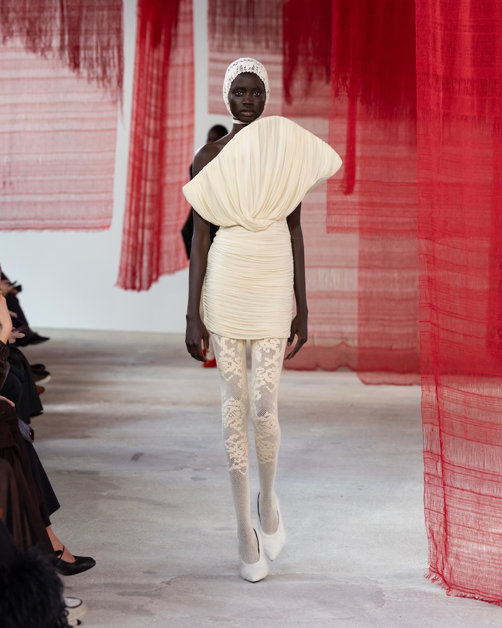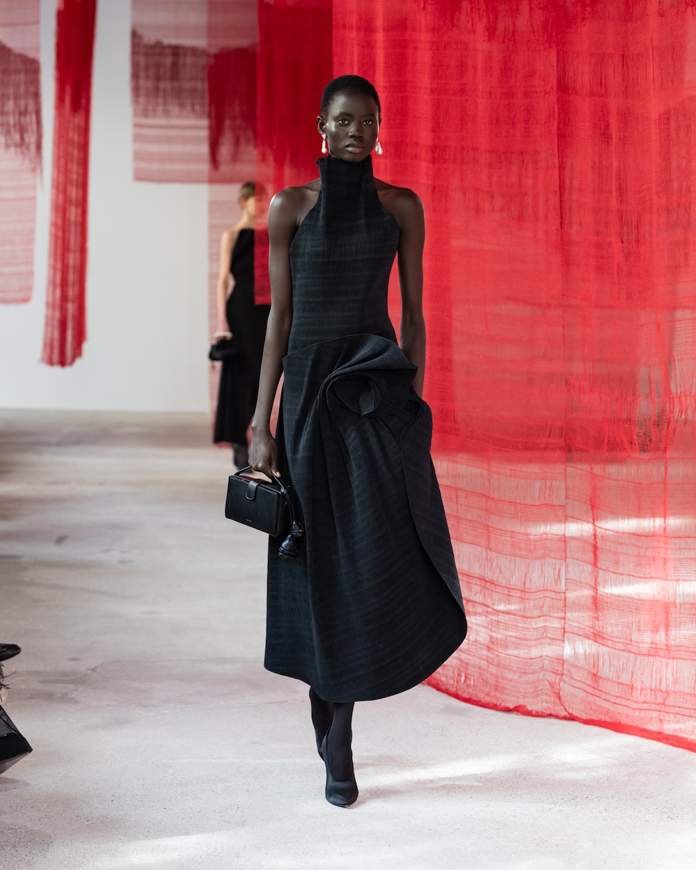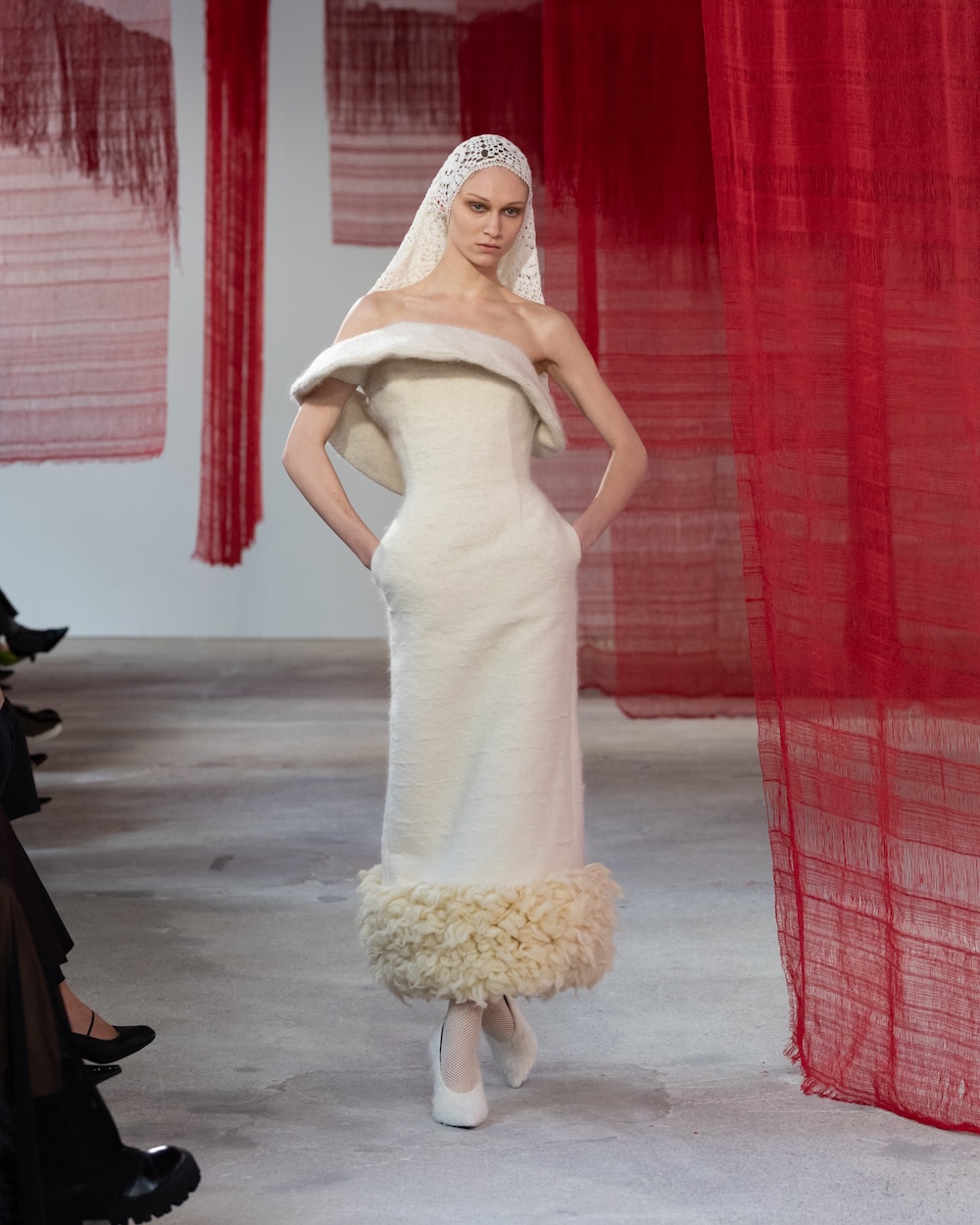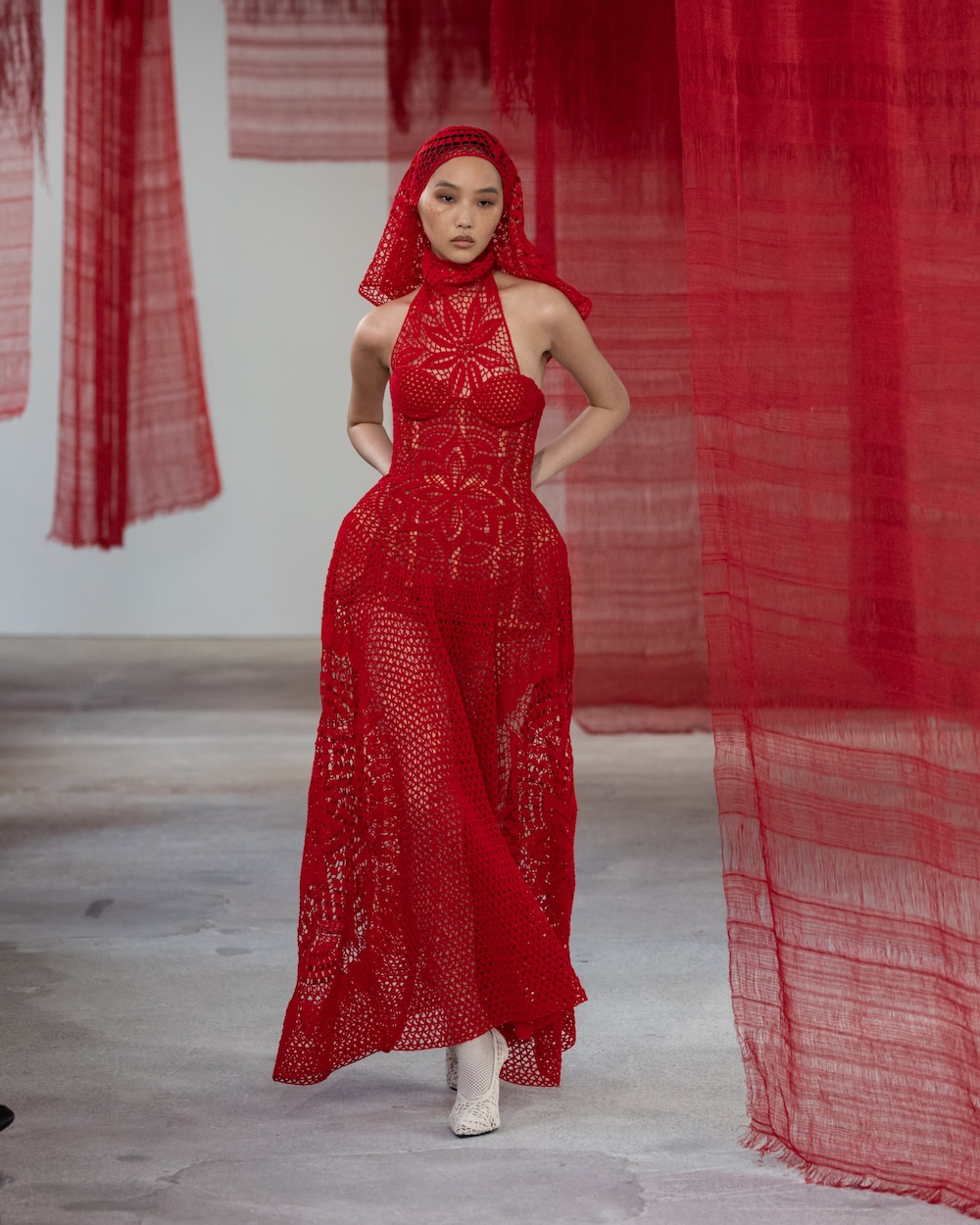Butrym has always had an affinity for the handmade, but here, she elevates it to something more profound. Inspired by Polish weaving traditions and the tactile artistry of figures like Magdalena Abakanowicz and Paulina Ołowska, she fuses textile craftsmanship with contemporary silhouettes. This influence is felt, particularly, in the way yarns twist and layer to form sculptural forms. Woven red fabric cascaded from the ceiling, an immersive backdrop handcrafted over 150 hours, setting the stage for a collection that speaks in the language of texture.