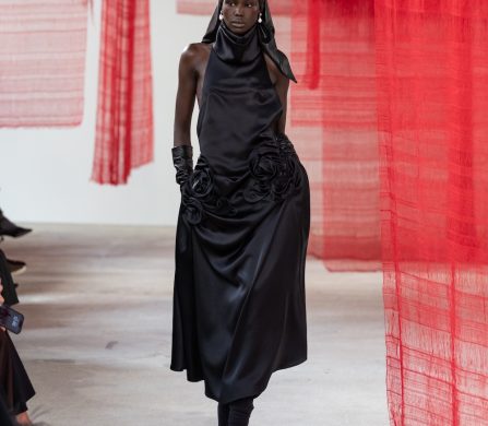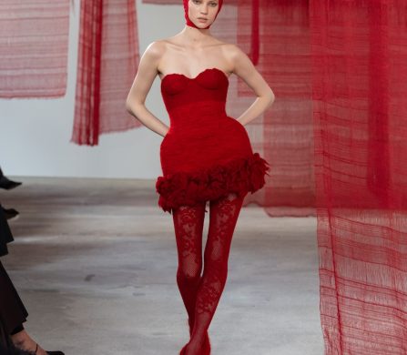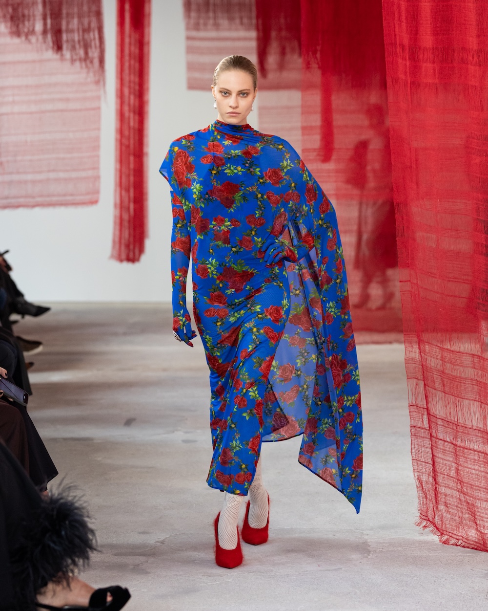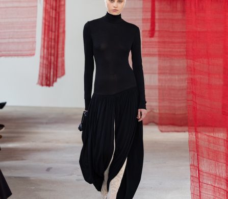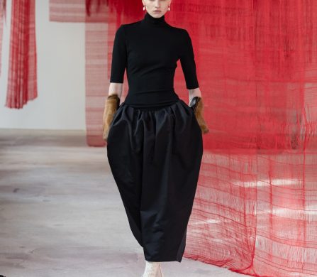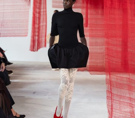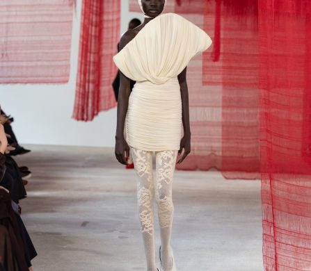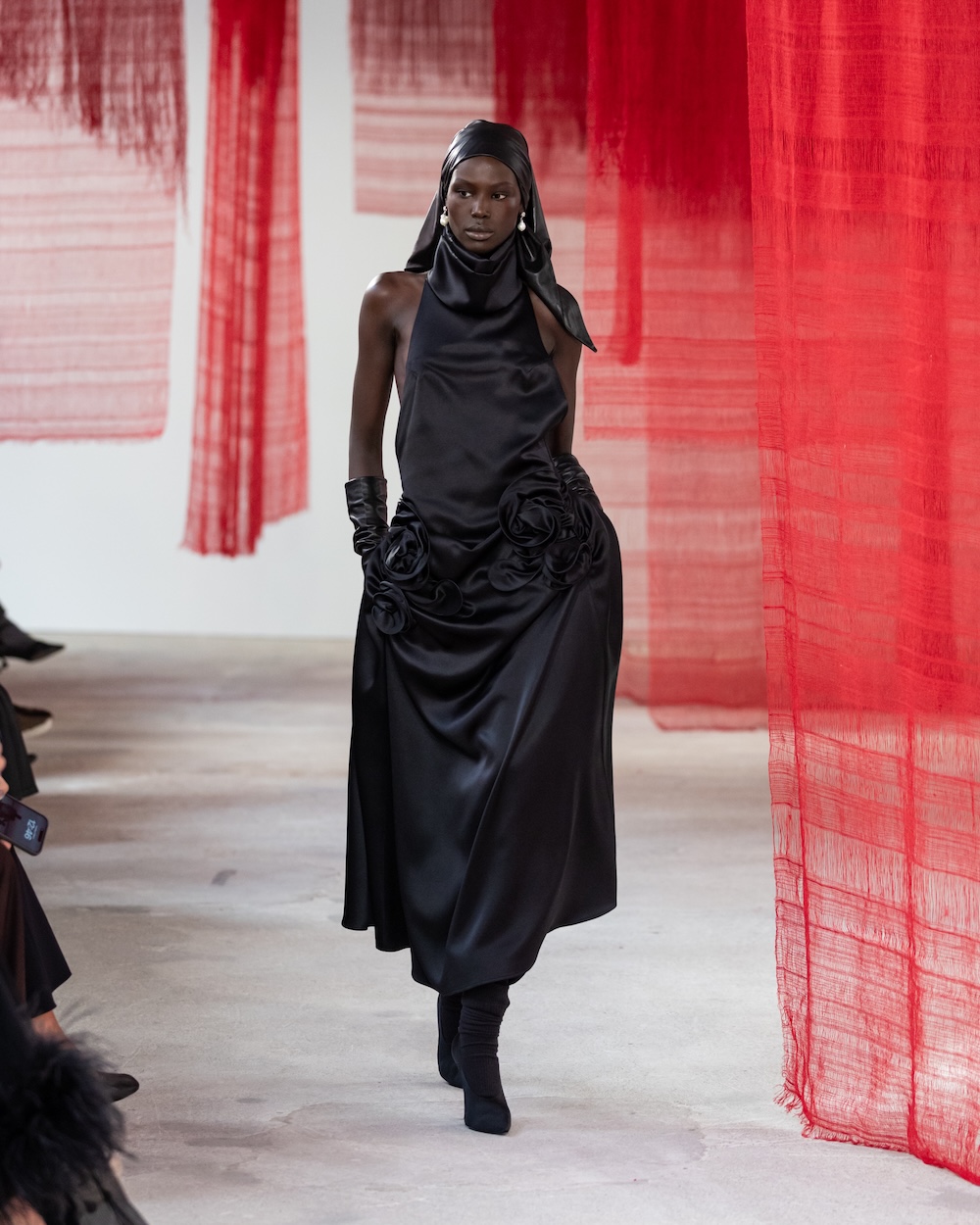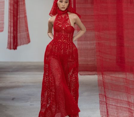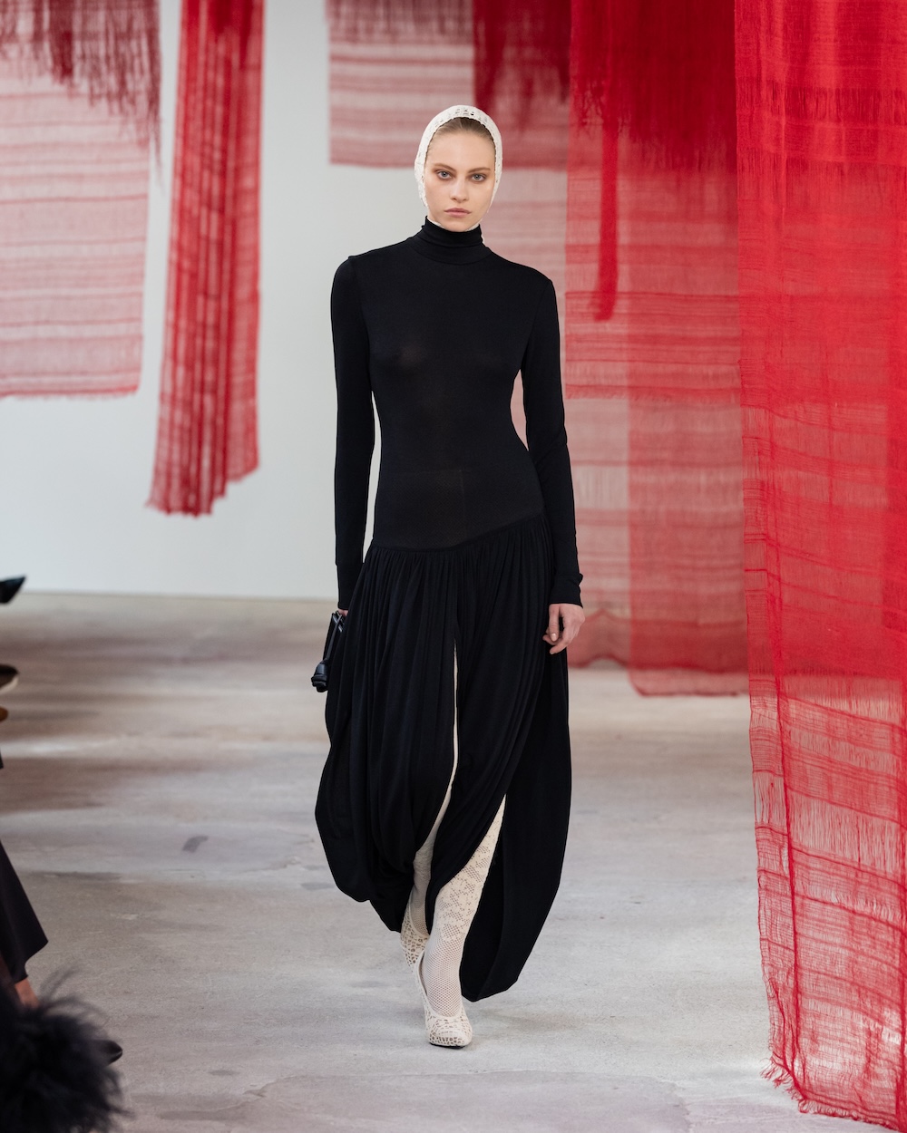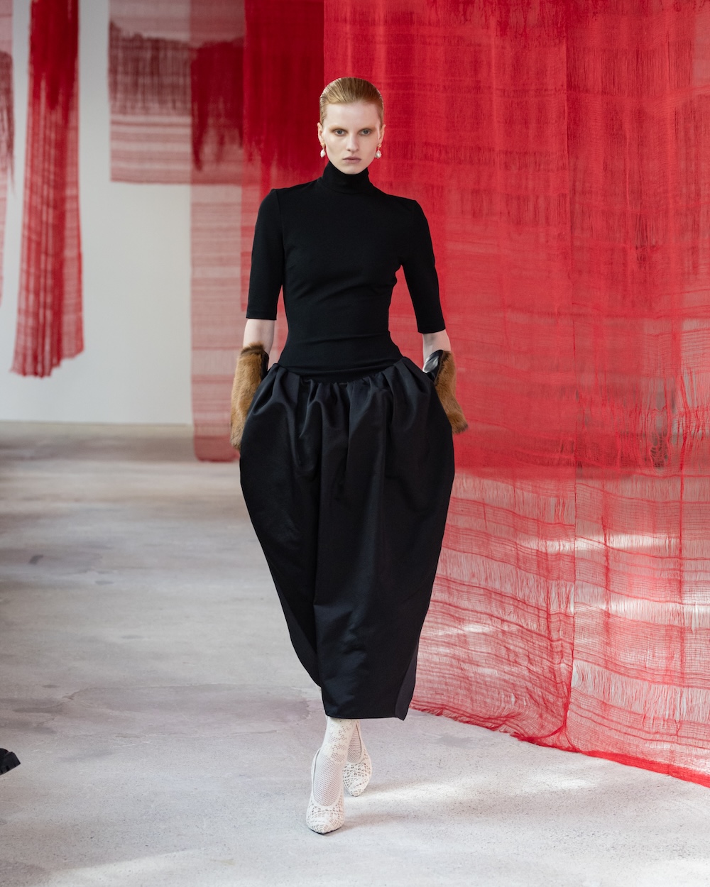Butrym has always had an affinity for the handmade, but here, she elevates it to something more profound. Inspired by Polish weaving traditions and the tactile artistry of figures like Magdalena Abakanowicz and Paulina Ołowska, she fuses textile craftsmanship with contemporary silhouettes. This influence is felt, particularly, in the way yarns twist and layer to form sculptural forms. Woven red fabric cascaded from the ceiling, an immersive backdrop handcrafted over 150 hours, setting the stage for a collection that speaks in the language of texture.