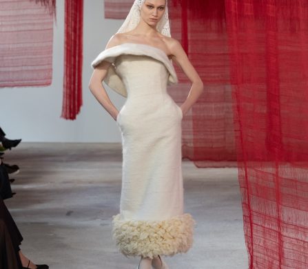 The opening look set the tone: a striking red mini dress, its intricate yarn construction sculpting the body with unapologetic confidence. Another standout — a tutu-like open-knit dress paired with a black slip — played with transparency and movement, embodying Butrym’s signature balance of sensuality and strength. But it was the finale that was the most poignant: a wedding dress, its crochet veil billowing behind, paired with cloud-like textured pumps. The silhouette, rich in layered textures, nodded to Polish folk tapestries, while the pure white hue symbolised renewal and possibility.