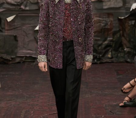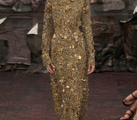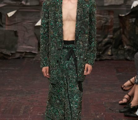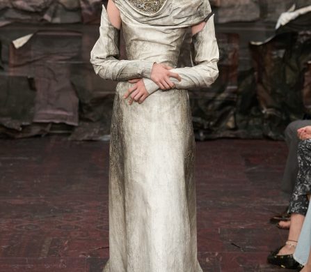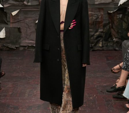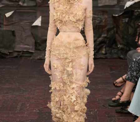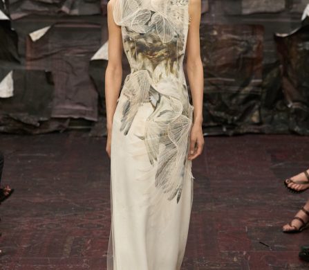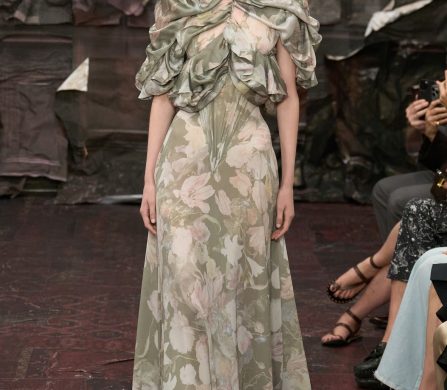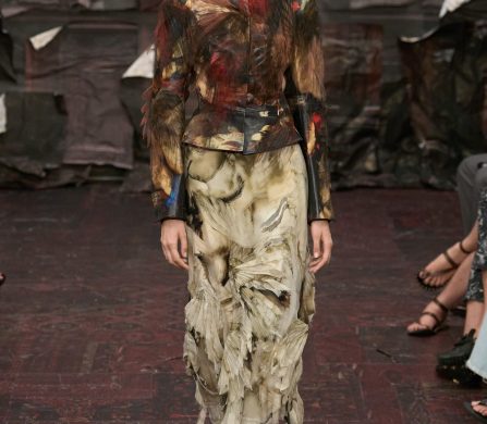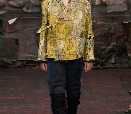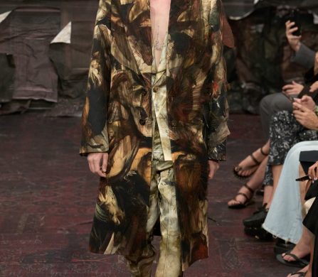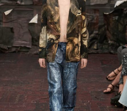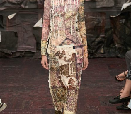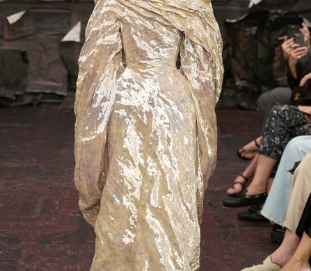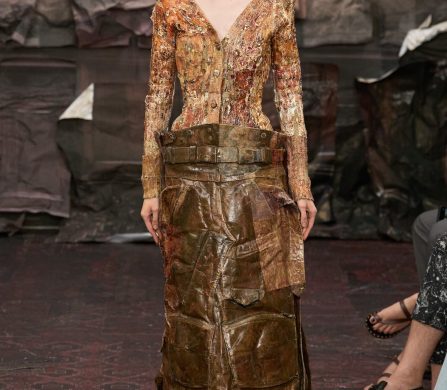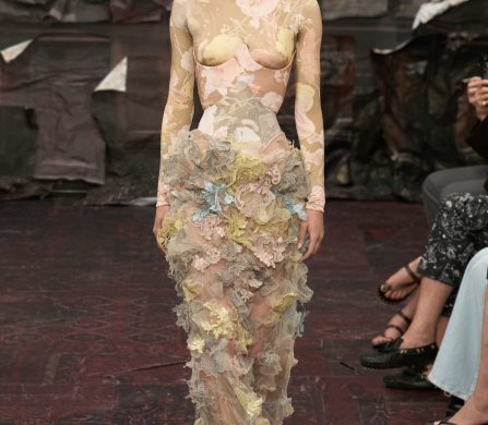 Martens reached for the Renaissance, but with a 21st-century eye that manifested fierce, unpolished, and oddly intimate. A stretch-crêpe gown covered in collaged still-life game paintings looked as if it might slink off the body when no one’s watching. A blush lace top and tulle skirt, fragmented into floating panels, hovered in place with an unsettling lightness.