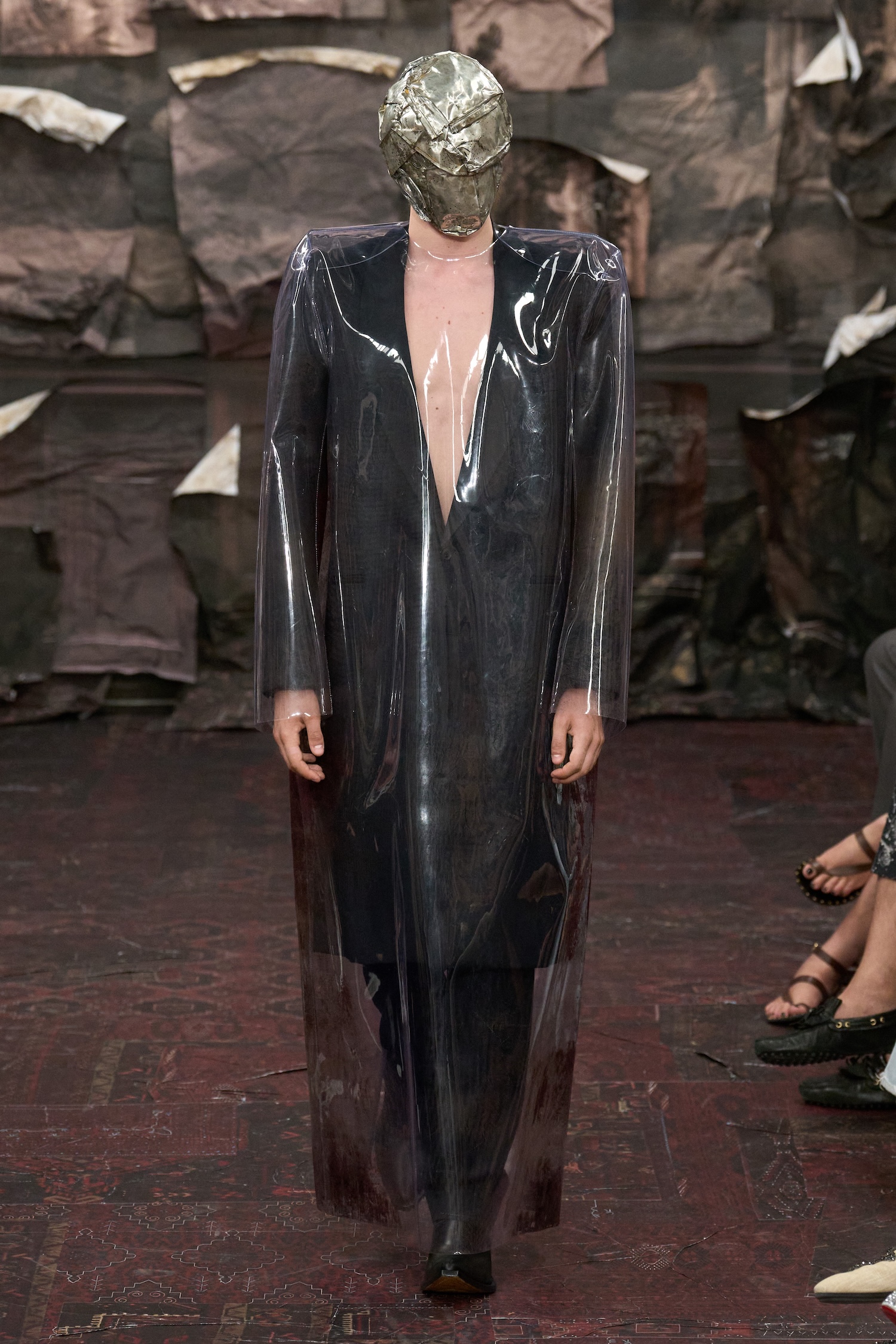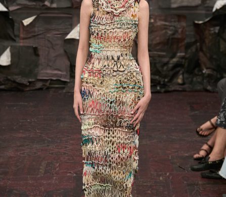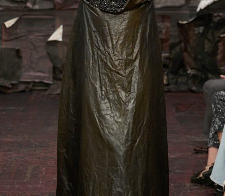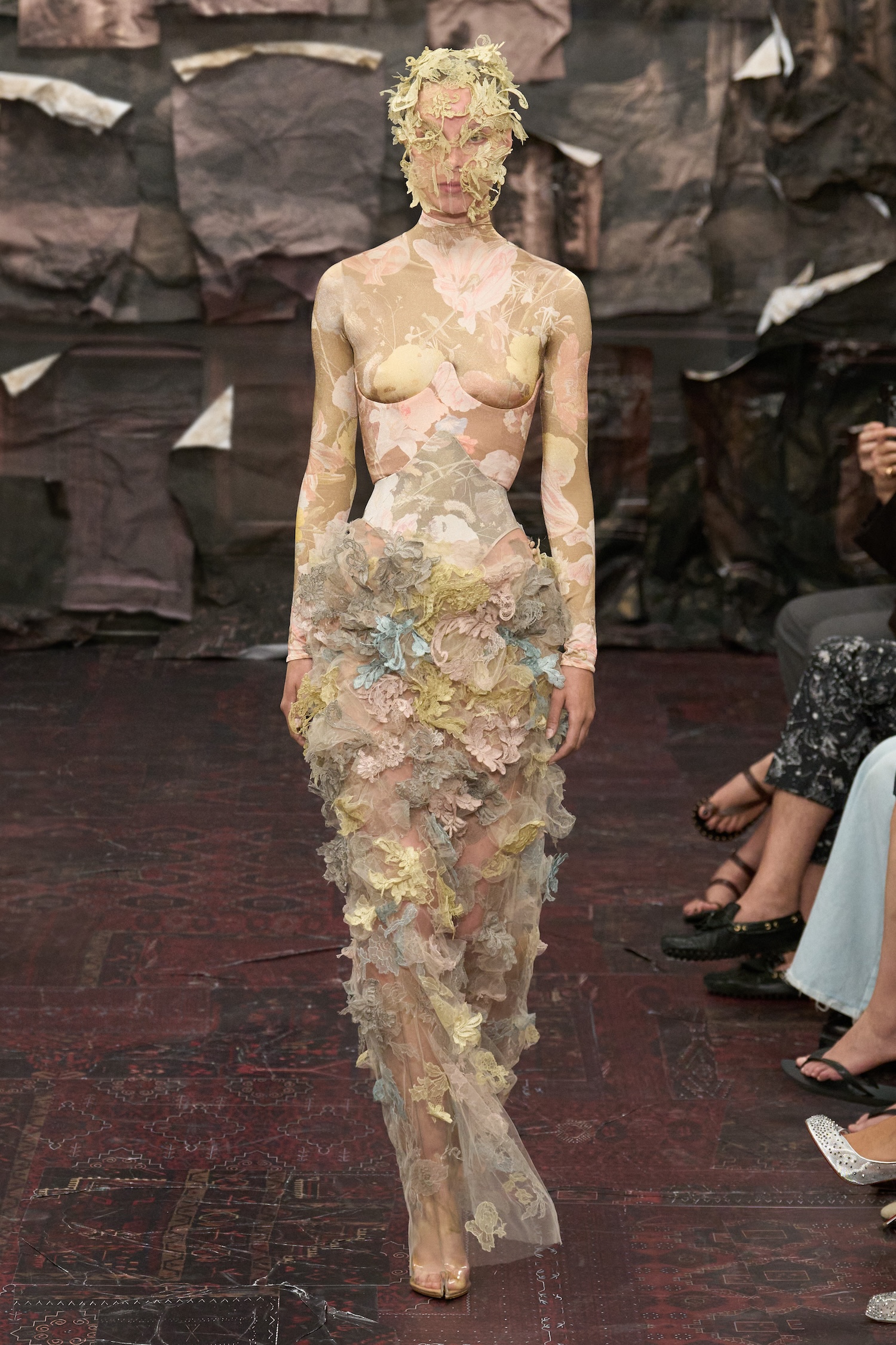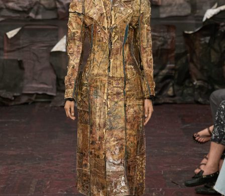 Materials jumped from the sacred to the mundane and back again: plastic crushed into coats, wallpaper prints layered over duchess satin, face masks stitched from biker jackets or crushed metal boxes. Lace dissolved into the skin, and jewellery (beads, deadstock chains) was reworked into fully knitted dresses, weighty and shimmering. One dress resembled a canvas dragged from a forgotten museum wall, hand-painted in trompe-l’œil brushstrokes. Another paired a gold skirt printed with floral wallpaper against a stark corset that looked almost medical. A transparent bustier over a layered underskirt caught the light like stained glass.