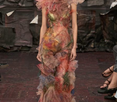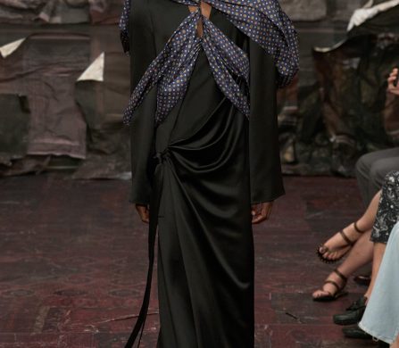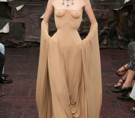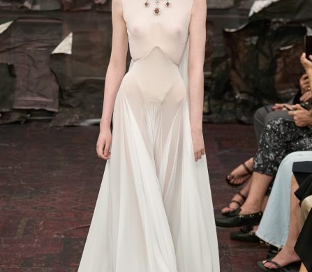 Models moved like spectral wraiths, wrapped in jersey that clung like melted marble, towering in capes that hovered behind them like stained-glass shadows. Dresses ballooned into gothic domes; corsetry sliced and framed the body like scaffolding. Even the softness had edge, with veiling that whispered more haunt than romance, tulle that flickered like fog catching candlelight. Silhouettes teetered between the saintly and the profane.