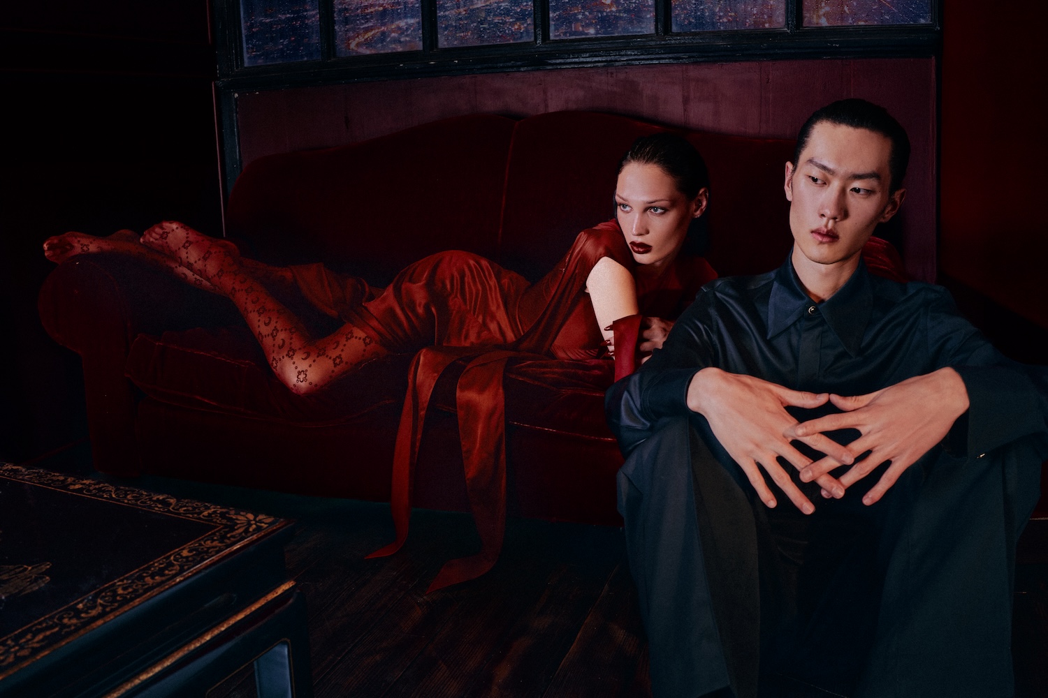 Shot again by Julia & Vincent with moving images by Adrien Lallau, Act III unfolds like a cinematic night in Shanghai. Every detail carries the charged stillness of Wong Kar Wai’s 2000 film ‘In the Mood for Love’: the deep crimson of a velvet sofa, neon lights bleeding through rain-slick windows, every detail heavy with atmosphere. Figures are suspended in silence, their connection etched entirely in the negative space, like the geometry of crossed legs, the arch of a back, the lingering, deliberate pause between two glances.