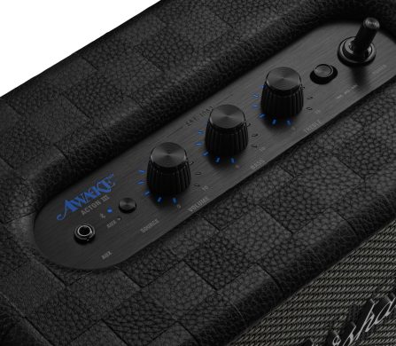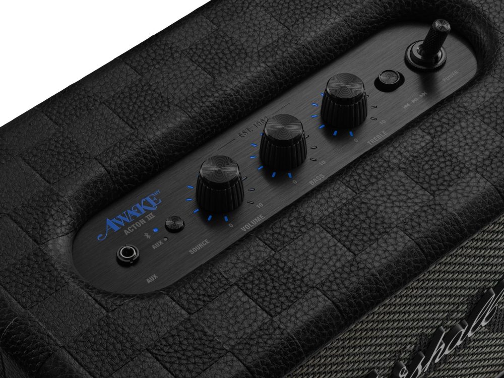The speaker features a bold black-on-black houndstooth pattern with embossed detailing and subtle blue LED accents, offering a modern twist on Marshall’s classic design. The grille showcases overlapping Marshall and Awake NY logos, symbolising the union of two cultural icons. Awake NY founder Angelo Baque’s streetwear sensibility shines through, transforming the speaker into a statement piece that balances audacity and sophistication.