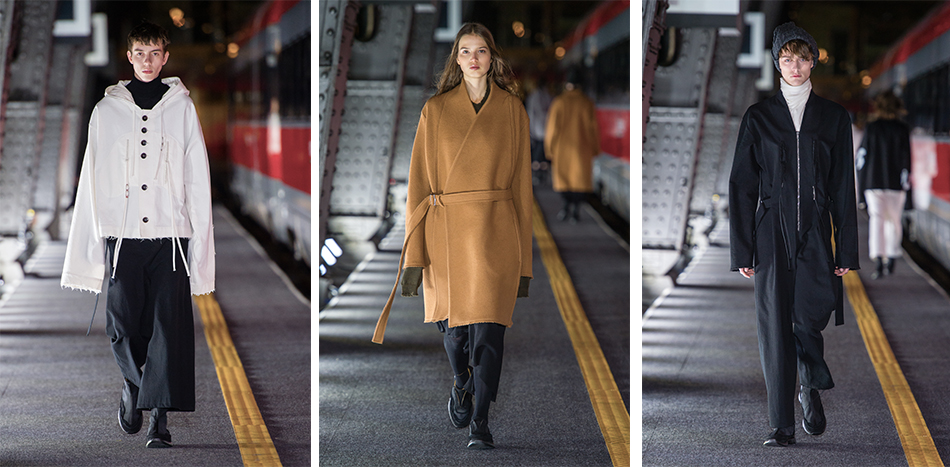 Within Milan’s central station, Damir Doma presented a brilliantly dark, industial collection with pops of white for autumn winter 2016. Silhouettes were oversized and sleeve lengths frayed and elongated as models walked down the platform alongside Frecciarossa’s 1000 express train. Kimono-esque jackets were synched at the waist whilst pea coat and blazers fastened with clusters of buttons on centre fronts.