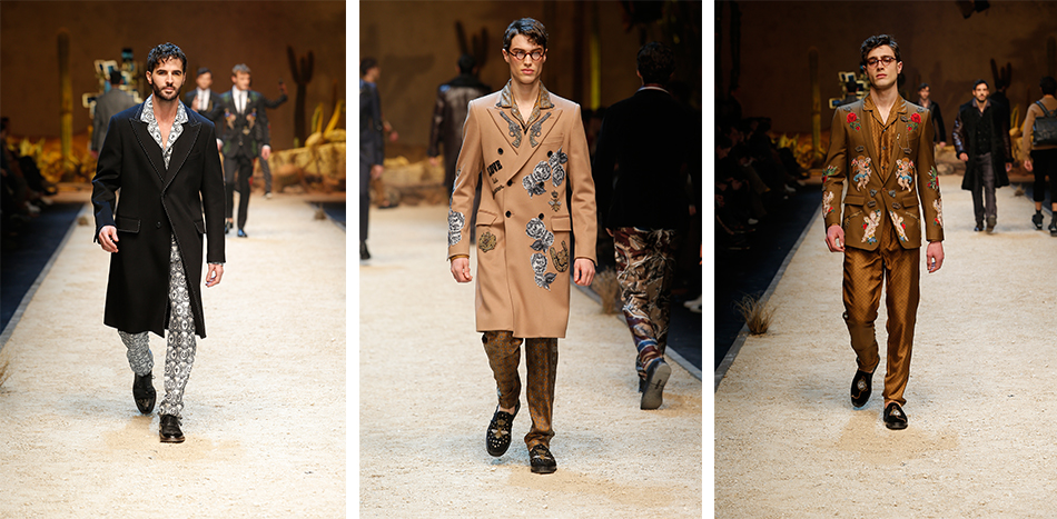 Heading far, far west, Dolce & Gabbana’s guy was on cue this season, with the Dolce family heading out to the Rockies for a sun kissed collection. Entire denim looks, biker and bomber jackets were covered by cacti, horse shoe and revolver badges, with one cartoon cowboy taking centre place on a high necked jumper as oversized fur coat and trousers accompanied Dolce & Gabbana’s recurring floral and cherub tapestries, which embellished tailored suiting. A highlight, other than the oversized Mongolian furs à la Tarantino were, was without a doubt the pyjama silk suits. To sleep, live or die in, forever.