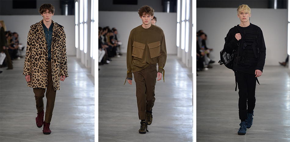 Large utilitarian pockets and khaki colours added military details to Alessandro Dell’Acqua’s urban collection for N°21. Straps hung from cuffs and cargo pockets positioned on thighs as drawstrings finished hemlines. Italian luxury arrived in the form of leopard prints and furs, next to biker jackets, flannel shirts and wool jumpers.