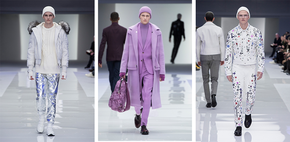 With Versace’s women campaign for Spring/Summer 2016 shot amongst snow covered mountains, galactic desert vibes continued with Donatella’s men wrapped up in fur lined jackets, puffa coats and woollen hats for the men’s collection. Space Futurism also evidently played a key role in Versace’s inspirations: reflective silver fabric formed trousers as eyelet hardware and crystals embellished white denim and combat style trousers. Violet, cool blue and peach sickly pastels contrasted with muted greys and blacks as a tribe of models space walked a crisp white runway. If that’s what life on Mars looks like, we’re there.