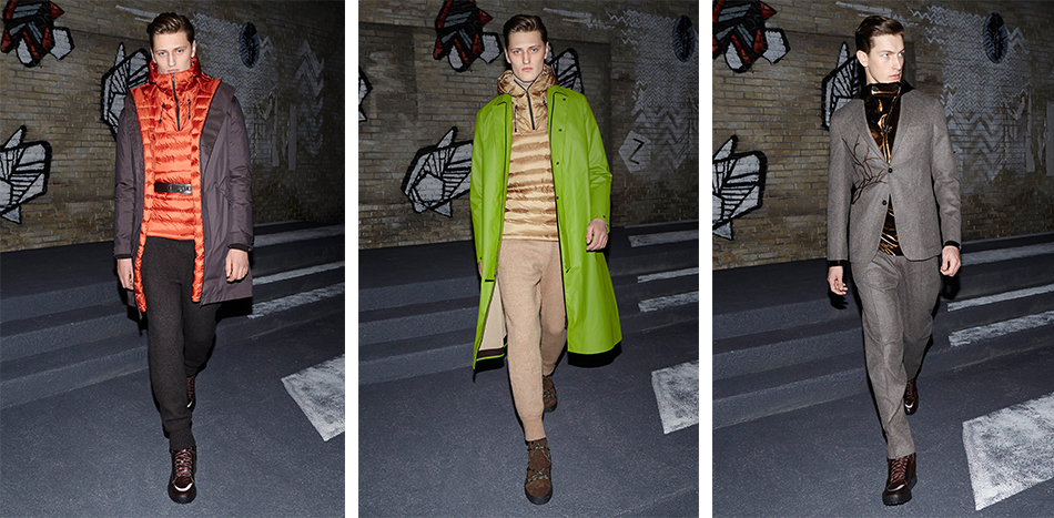 Z Zegna’s man was wrapped up for Autumn/Winter 2016. Layered under puffa coats and elongated bombers were hoodies and turtlenecks, synched at the waist with leather belts. A delectable colour palette of lime, beige, grey and orange modernised Italian tailoring whilst autumnal twig prints and hiking boots urbanised suiting.