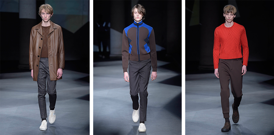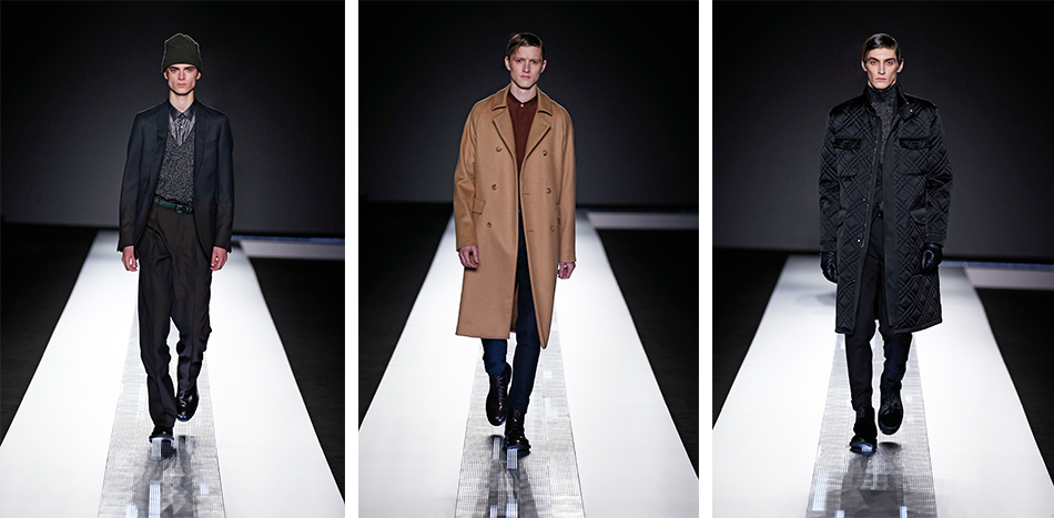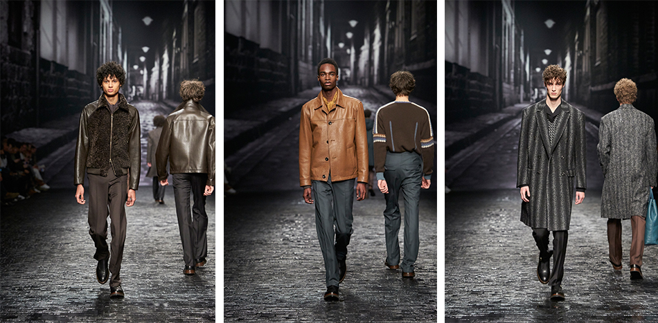 Mustard, brown and green tones dominated Corneliani’s winter show as models walked a cobbled runway. Trench coats, biker jackets and blazers finished winter looks including 1940s style printed cable-knit jumpers and high waisted suiting trousers, accessorised with milanese leather totes and classic brogues.