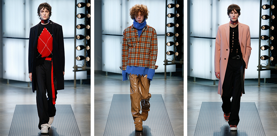 Oversized shearling jackets, overcoats and hoodies topped shirt and ties with blue, white and red line prints for a modernised take on smart tailoring.