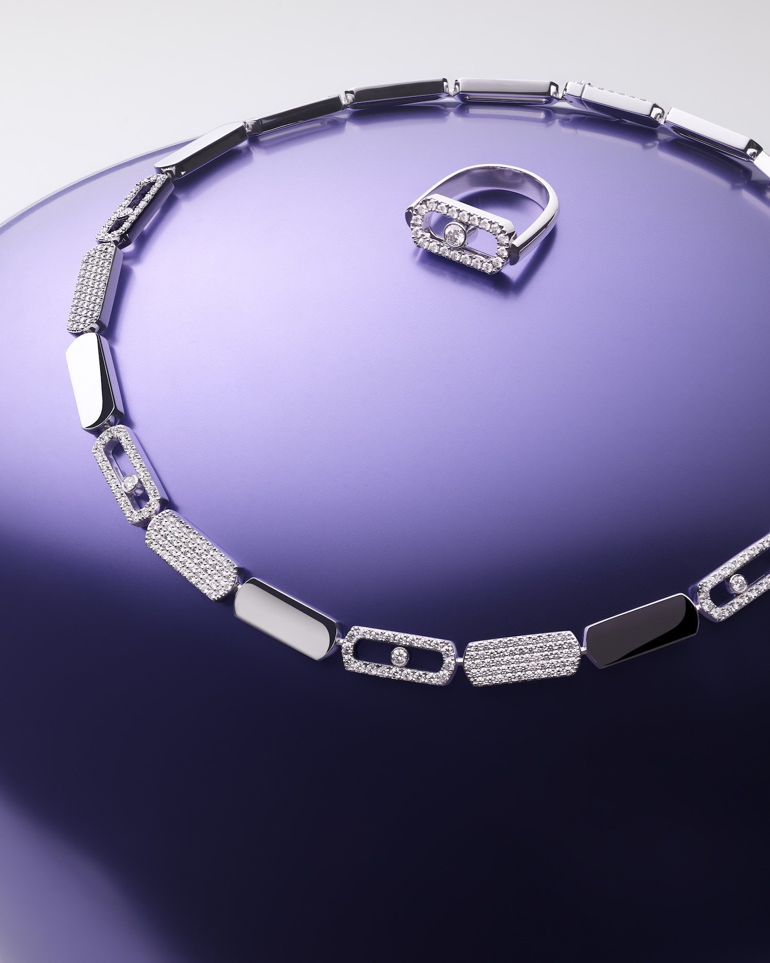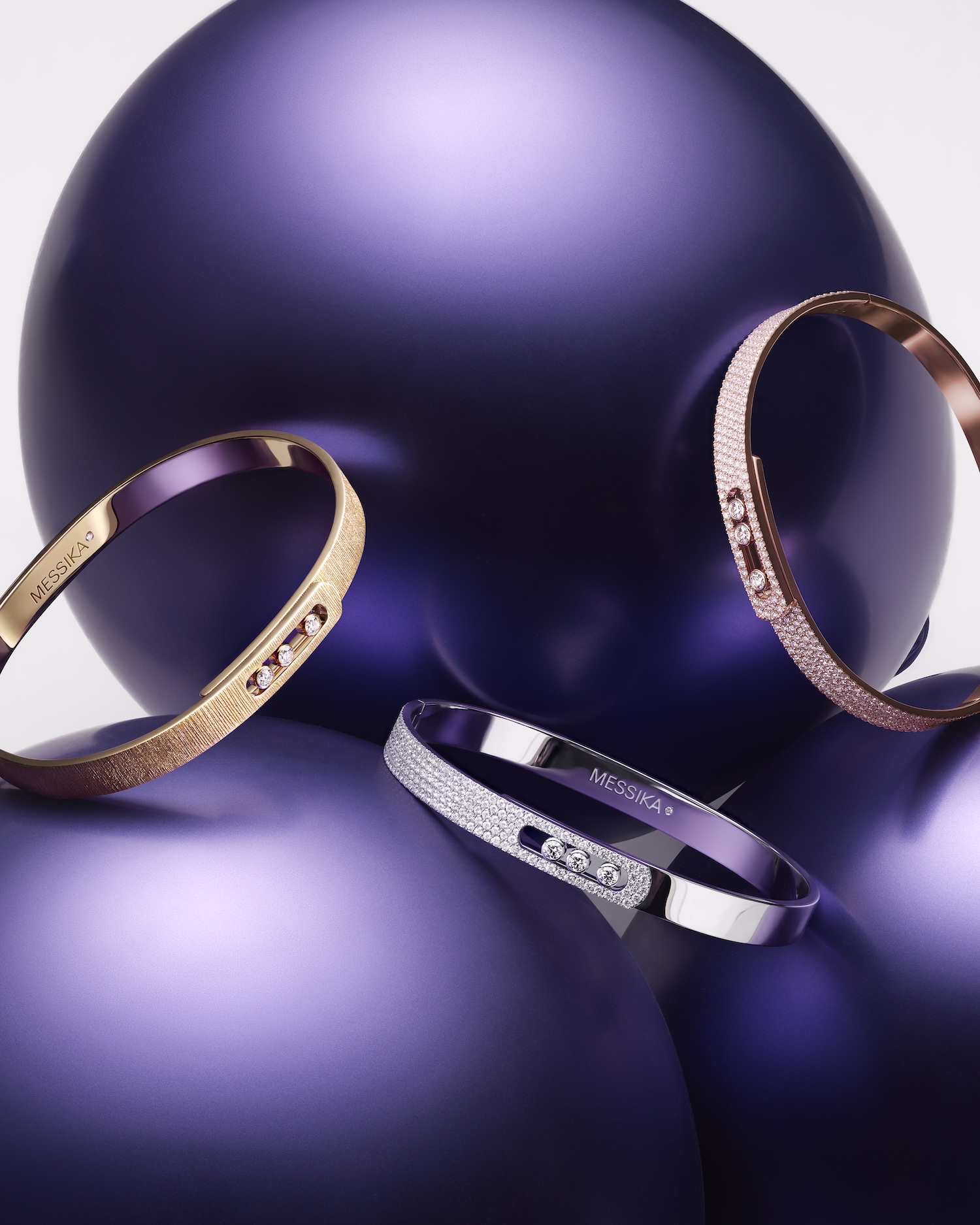 Messika hasn’t limited the festivities to print, either. If you walk past their boutiques this winter, you’re in for a treat. They’ve commissioned massive, jewel-glazed cakes sculpted in purple and frosted with their iconic Move motifs for the window displays.