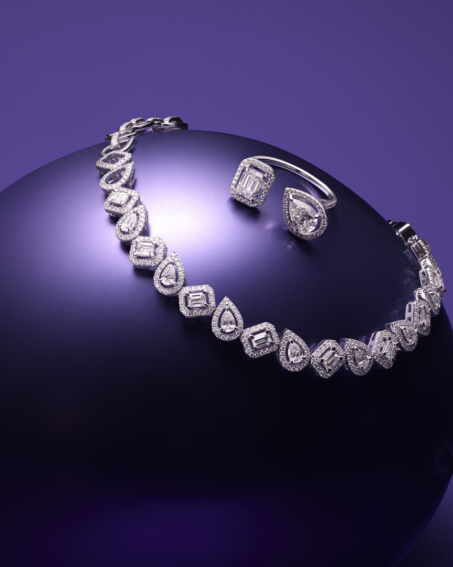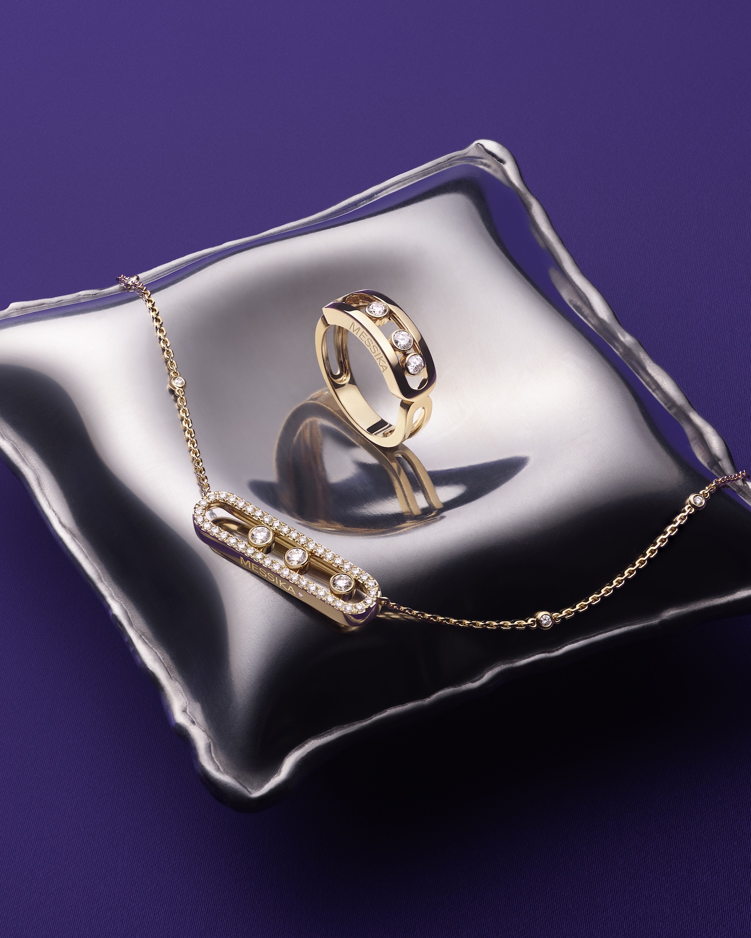 Messika hasn’t limited the festivities to print, either. If you walk past their boutiques this winter, you’re in for a treat. They’ve commissioned massive, jewel-glazed cakes sculpted in purple and frosted with their iconic Move motifs for the window displays.