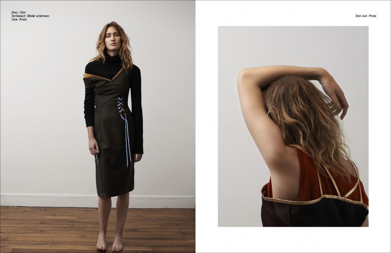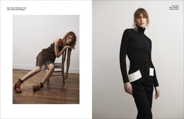 Left to Right/ Dress, Knit and Underwear / Prada  Shoes / Maison Martin Margiela Opposite Top / Kenzo  Pants / Givenchy  Earring / Céline
