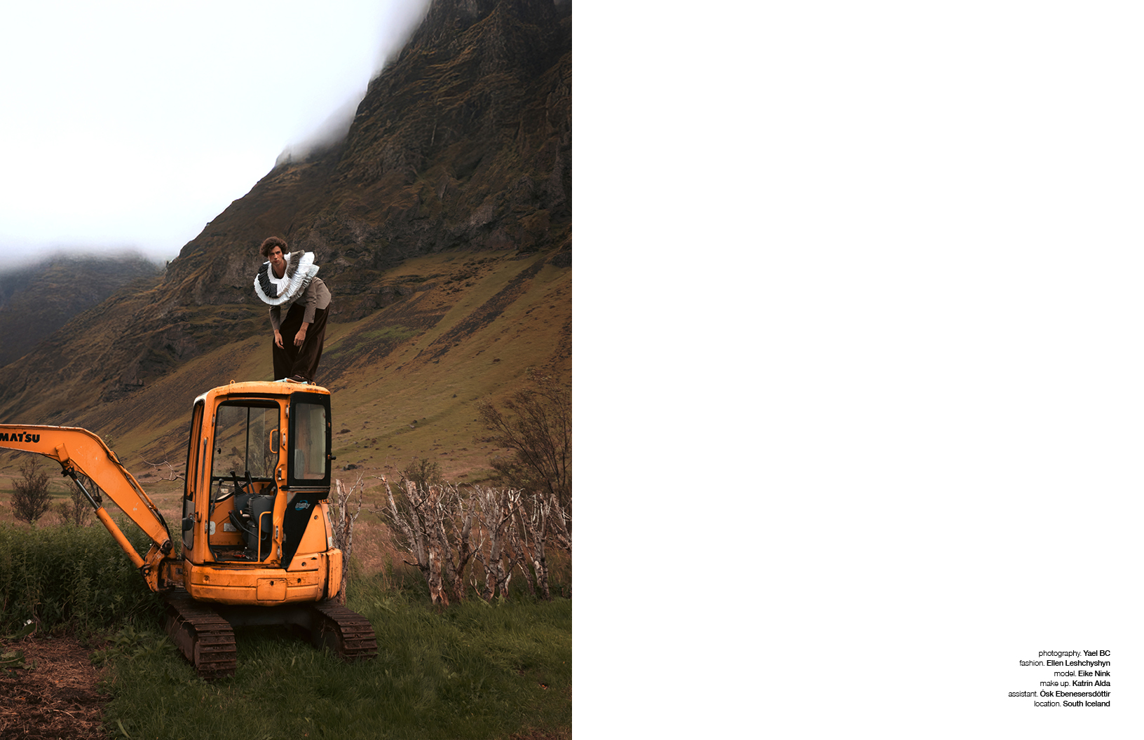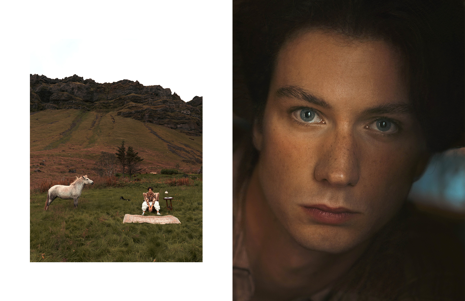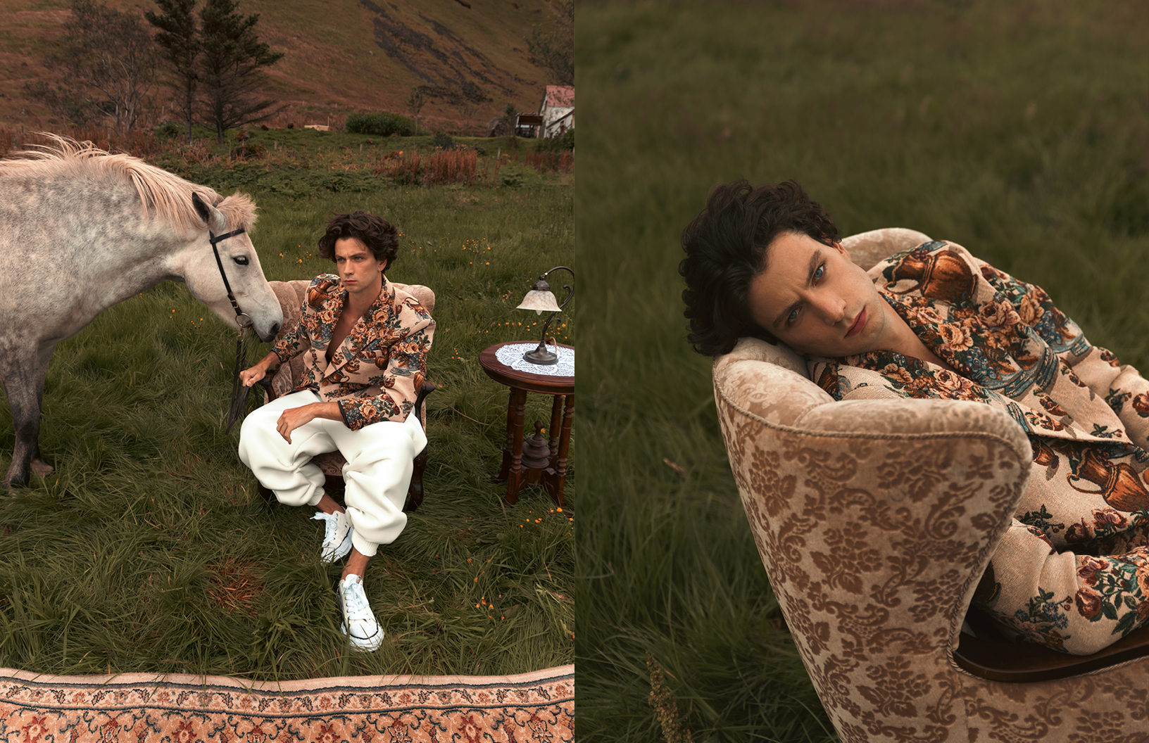 In this Schön! editorial, photographer Yael BC explores dislocation, comfort, and absurdity through a cinematic lens. “A man, Eike Nink, arrives — possibly from nowhere, possibly from the past — and settles into a landscape that resists explanation,” explains Yael. “Vintage furniture in lava fields, an excavator as a throne, a lone horse bearing witness. The fashion choices by Ellen Leshchyshyn shift between elevated heritage and playful eccentricity, grounding the character in a fictional yet emotionally familiar world. The editorial invites a gentle tension between elegance and surrealism, solitude and performance, where domesticity is staged in the open wild and identity is both theatrical and sincere.”