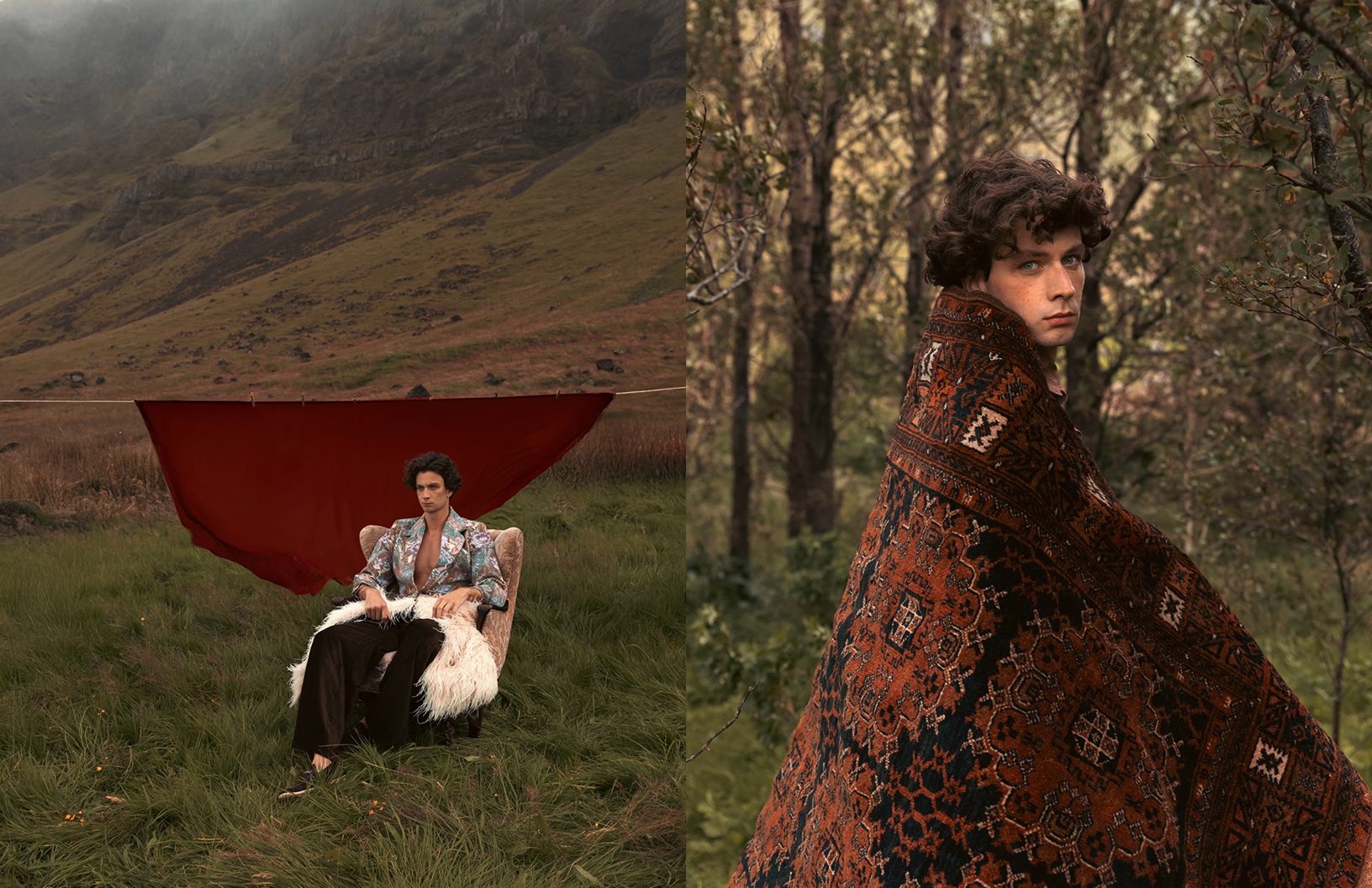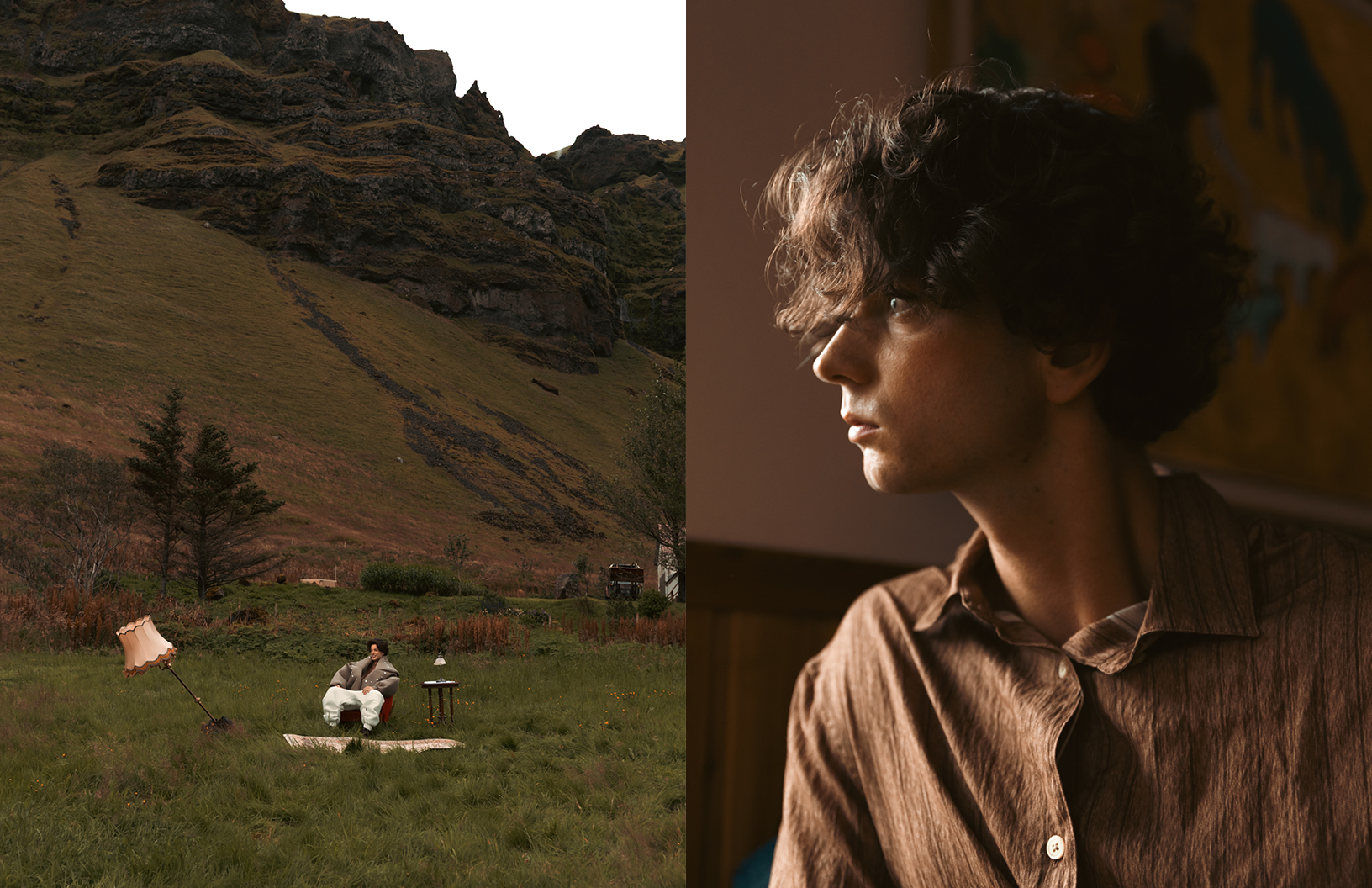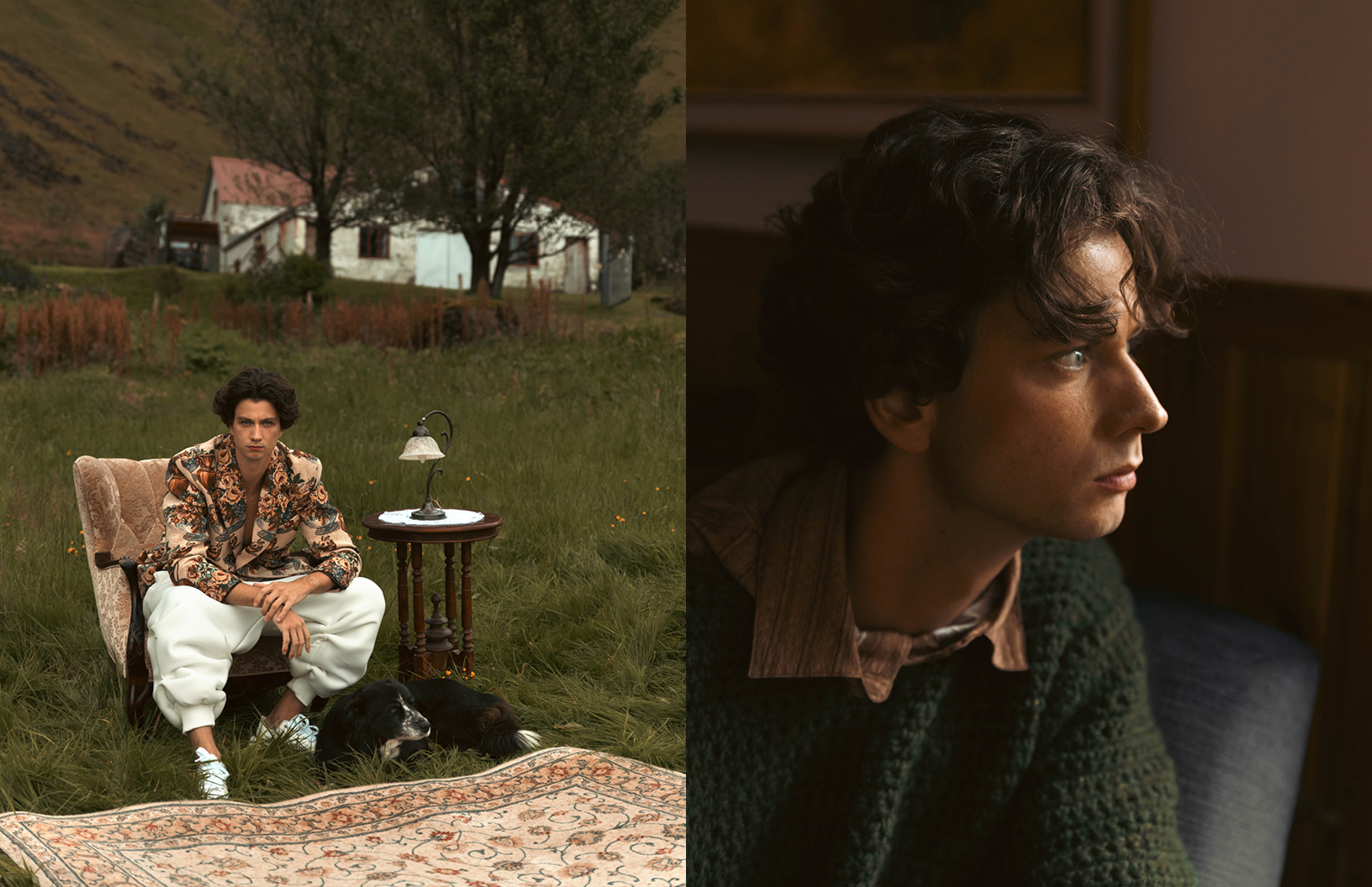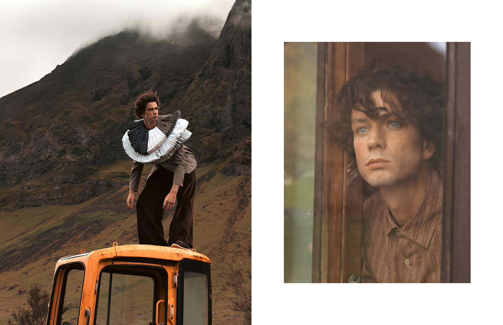 In this Schön! editorial, photographer Yael BC explores dislocation, comfort, and absurdity through a cinematic lens. “A man, Eike Nink, arrives — possibly from nowhere, possibly from the past — and settles into a landscape that resists explanation,” explains Yael. “Vintage furniture in lava fields, an excavator as a throne, a lone horse bearing witness. The fashion choices by Ellen Leshchyshyn shift between elevated heritage and playful eccentricity, grounding the character in a fictional yet emotionally familiar world. The editorial invites a gentle tension between elegance and surrealism, solitude and performance, where domesticity is staged in the open wild and identity is both theatrical and sincere.”