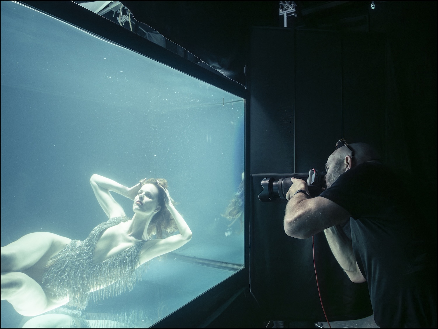 It’s a blustery day in London, but inside the cavernous set, everything is hushed except for the slow, hypnotic swirl of water — and the unexpected beats of Snoop Dogg playing softly in the background. Eva Herzigová, submerged in a vast tank, floats like a liquid sculpture, her skintight top rippling with every move. Norwegian photographer Sølve Sundsbø watches through the glass, capturing each interplay of light, shadow, and breath. Makeup maestro Val Garland hovers nearby, ensuring every detail survives the watery distortion. The soundtrack is a quirky touch from Herzigová herself — because even underwater, she’s keeping it cool with a little hip-hop vibes.