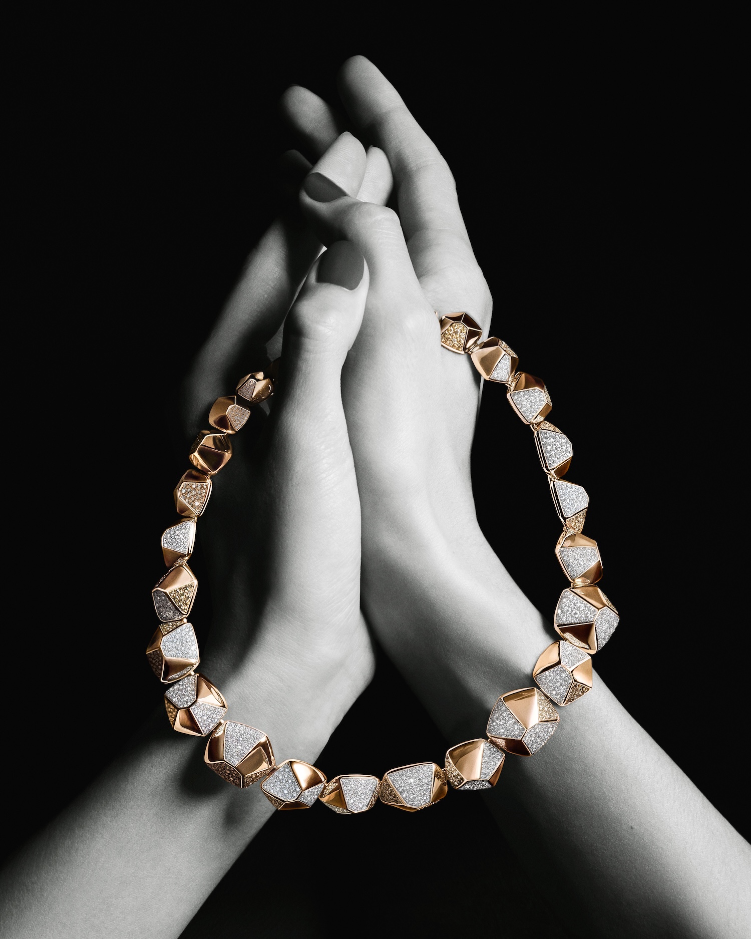 The ‘Nudo’ collection, famous for its ‘naked’ gemstones that ditch traditional prongs, appears like a kaleidoscope of joy against the shadows. We also see the structured Pentagoni links and the fluid gold of the Catene and Iconica lines, which wrap around the wrist with a sensual, Milanese energy. For those who prefer a more sentimental touch, ‘Pomellato Together’ explores the geometry of connection through interlocking rose gold and diamonds.