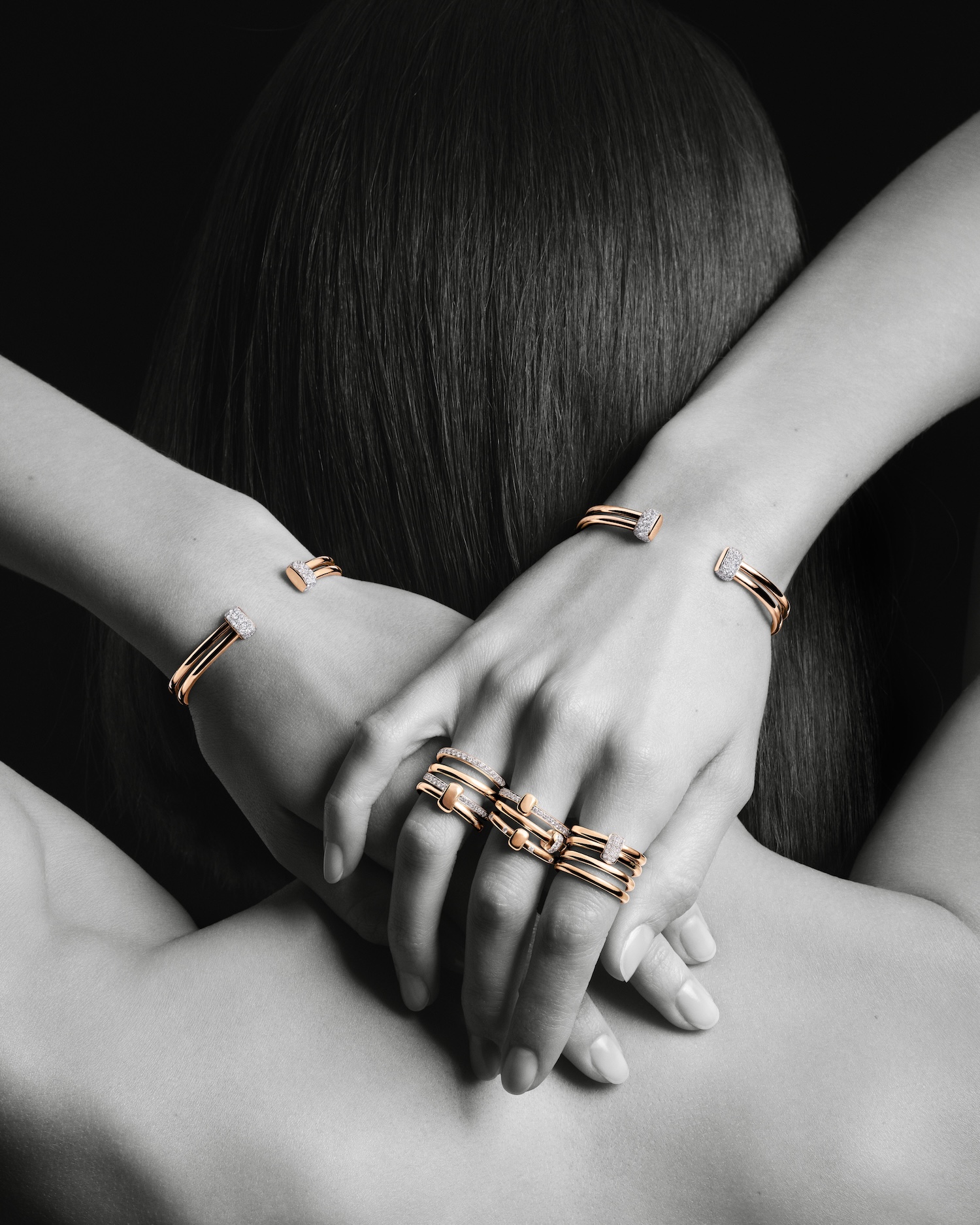 Against this minimalist backdrop, the house’s icons truly take the spotlight. By draining the frames of almost all their colour, Pomellato ensures that the only thing igniting on screen is the jewellery. Across rings, necklaces, earrings and bracelets, the campaign uses this stark contrast to turn every gemstone into a vivid, saturated punch of light.
